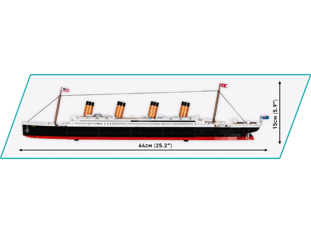 Postavte si unikátní model britského zaoceánského parníku Titanik, který byl vytvořen v roce 1911. Titanik byl jedním ze tří parníků typu Olympic, dalšími byli Olympic a Gigantic. Model je v měřítku 1:450 a sestavený měří 64 x 15 cm. Balení obsahuje 722 kostek stavebnice. Neobsahuje figurky. Na spodní straně lodi jsou kolečka, která umožňují pohyb na pevné podložce.