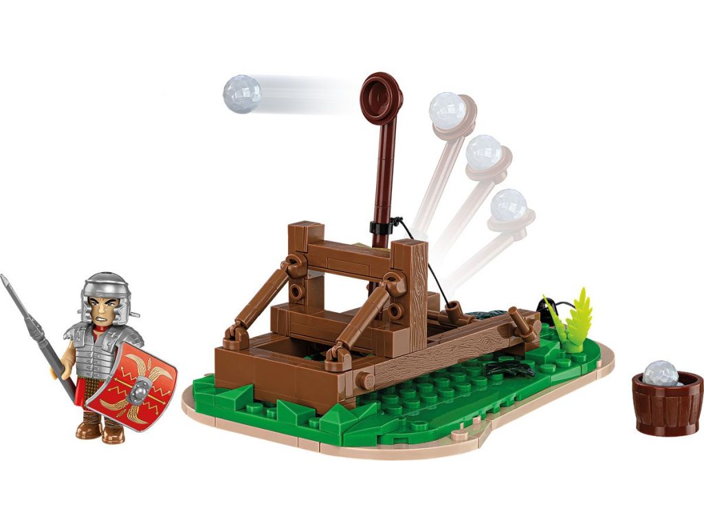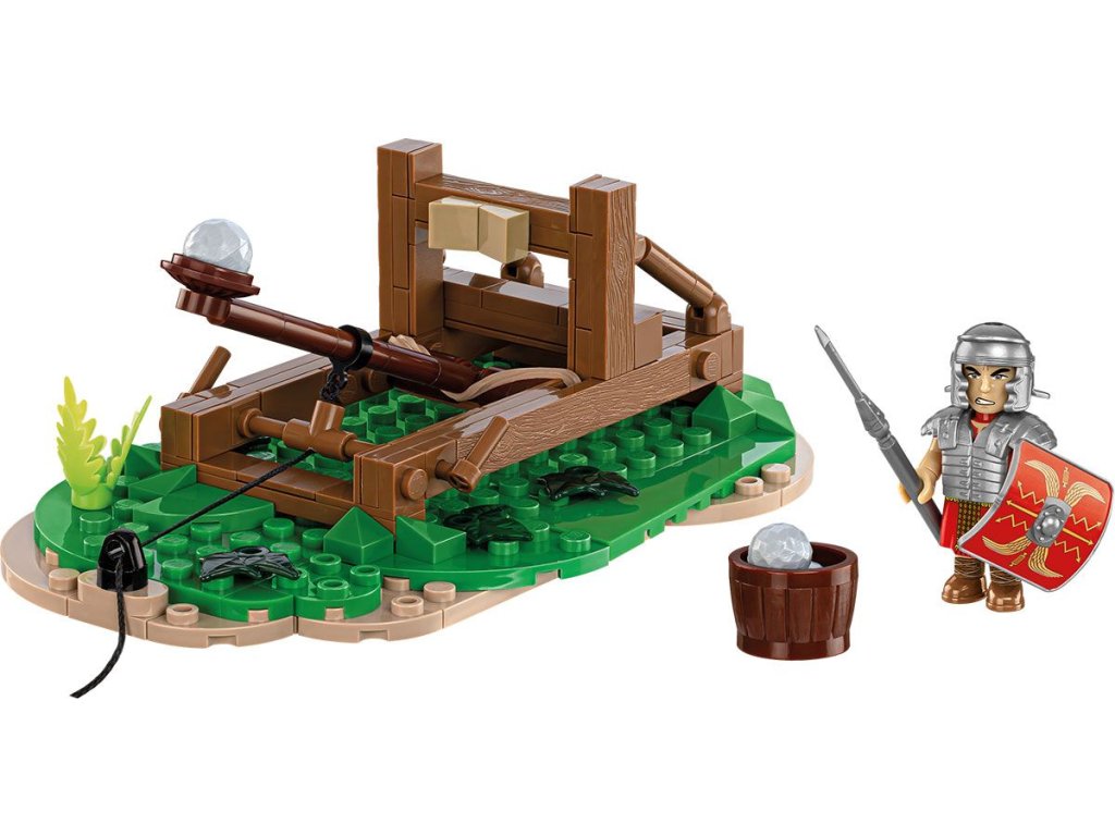 V našem modelu jsme místo zamotaných lan použili gumičku k natažení paže! Díky tomuto řešení můžete rychle a bezpečně zahájit vlastní obléhání a vrhat projektily z kostek stavebnice! Sada obsahuje římského legionáře vybaveného helmou (galea), brněním (lorica segmentata), štítem (scutum) a oštěpem (pilum). Speciální díl rozšiřující tuniku nese potisky závěsných opasků (baltea). Katapult můžete umístit na přiložený podstavec napodobující fragment terénu. Ujišťujeme vás, že díky chytrému mechanismu bude hraní s katapultem velká zábava!