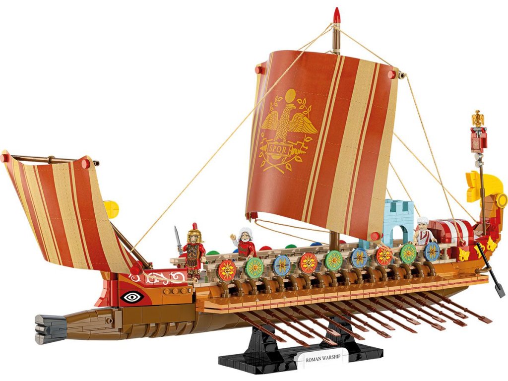 Naše moře (Mare Nostrum), jak ho Římané nazývali. Je to proto, že Středozemní moře bylo vnitřním mořem Římské říše. Vládu nad ním zajišťovaly lodě poháněné silou lidských svalů a plachtami. Po staletí se po moři majestátně plavily galeje a liburny a střežily pořádek! Postavte si krásnou válečnou loď samotného císaře ze stavebnice Cobi a vystavte ji na podstavci! Podívejte se, kolik má detailů. Nasaďte barevné plachty a lanoví. Sada obsahuje tři figurky: císaře Marca Aurelia (Marcus Aurelius Antoninus), senátora a římského generála, které mají spoustu potisků a detailů! Na lodi je také prapor legie se zlatým orlem. Žádná armáda se bez něj neobejde! Jakmile je válečná loď postavena, vypadá majestátně a jistě upoutá pozornost každého, kdo ji uvidí!