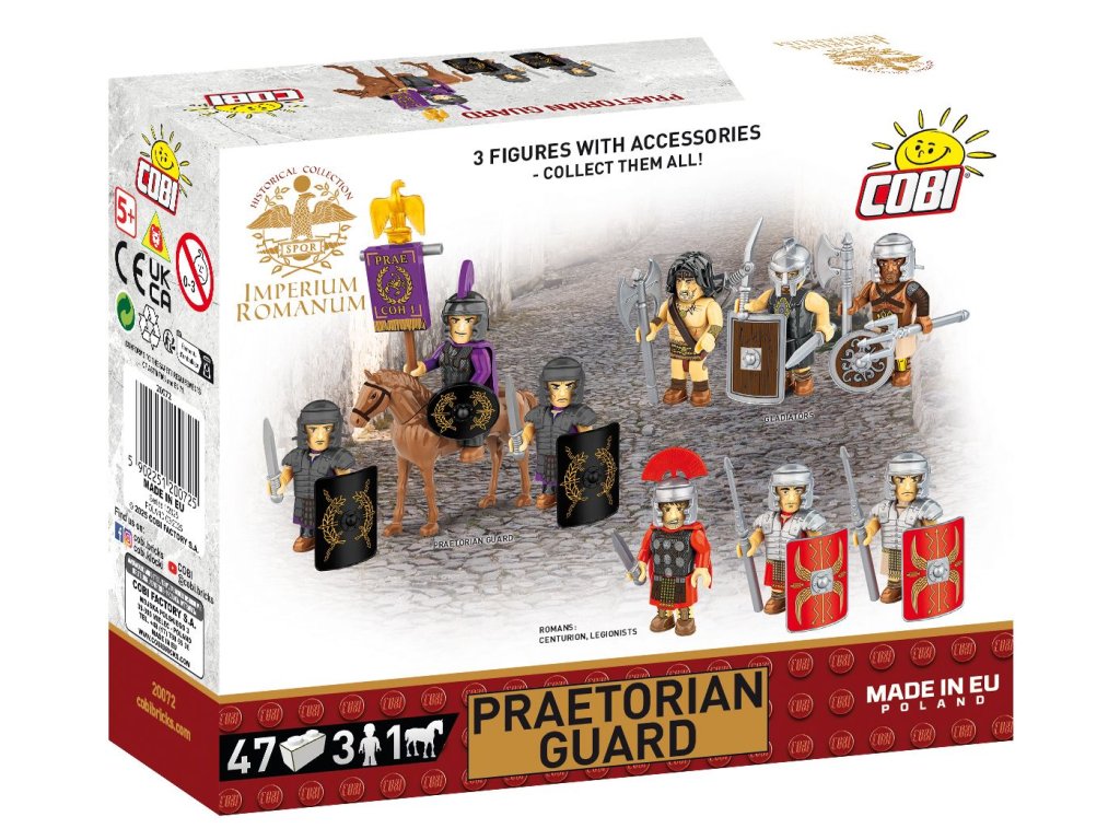 V této sadě najdete tři pečlivě zpracované figurky pretoriánů v plné zbroji. Mezi nimi je prefekt – velitel císařské gardy, sedící na koni s malým důstojnickým štítem zvaným parma. Navíc sada obsahuje prapor (aquila), který symbolizoval moc Říma. Zbývající pretoriáni jsou vyzbrojeni jako legionáři přilbami (galea), štíty (scutum), segmentovou zbrojí (lorica segmentata) a krátkým mečem zvaným gladius.