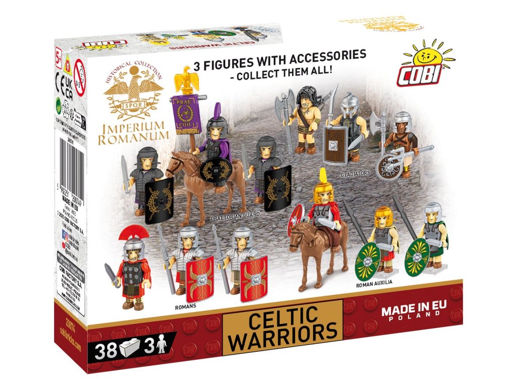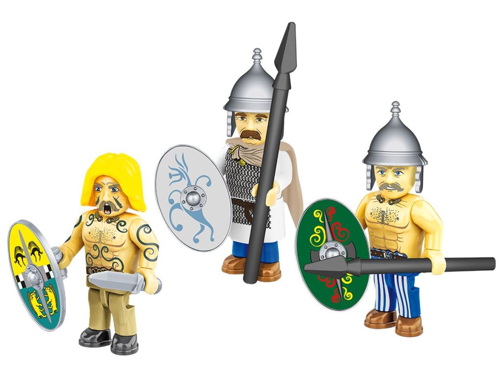 Tato sada vám umožňuje sestavit tři detailní keltské válečníky – připravené bojovat proti římským legiím! Štíty keltských válečníků a charakteristické modré vzory na jejich tělech byly reprodukovány s velkým důrazem na detail. Součástí jsou realistické doplňky: nové helmy, kopí, meč a zdobené štíty – každý s jiným designem! Ať začne povstání proti Římu!