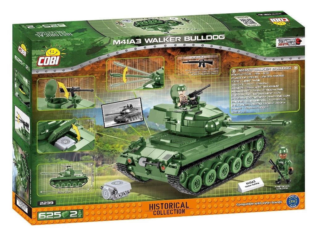 Postavte si model Walker Bulldog, amerického lehkého průzkumného tanku z období Studené války. Do služby vstoupil v roce 1951 a postupně nahradil již zastaralý M24 Chaffee. Vyznačoval se dobrým pancířem a rychlostí. Byl vyzbrojen 76,2 mm kanónem M32. Bohužel motor měl velkou spotřebu paliva a byl velmi hlučný, což byla bezpochyby nevýhoda tohoto vozidla. Celkem bylo vyrobeno 5 500 kusů.