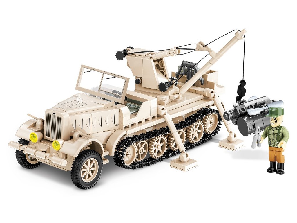 Postavte si model Sd.Kfz. 9/1 „FAMO“, což bylo největší z rodiny německých polopásových vozidel z 2. světové války. Bylo konstruováno jako těžký dělostřelecký tahač, ale jeho provoz ve válečných podmínkách mu dal jiné úkoly. Vozidlo bylo využíváno především v opravárenských jednotkách a sloužilo k evakuaci obrněných vozidel. jak se obrněné zbraně vyvíjely, byly stále těžší, takže musely být taženy dvěma nebo dokonce třemi vozidly tohoto typu. Famo bylo poháněno motorem Maybach HL 108. Stejné pohonné jednotky byly instalovány v prvních verzích Pz. Kpfw. III a IV. Tahač verze 9/1 byl vybaven šestitunovým jeřábem Bildstein. Balení obsahuje 498 kostek stavebnice a 1 figurku vojáka.