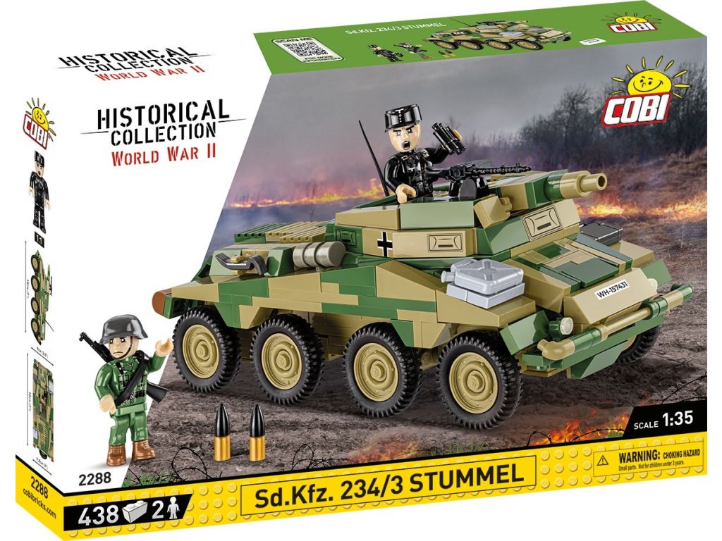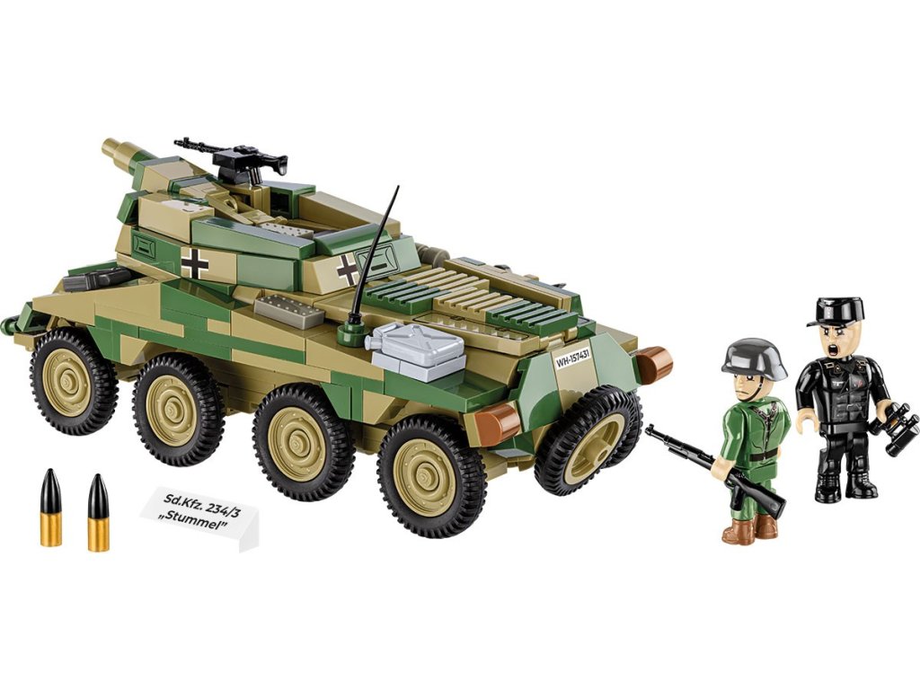 Postavte si model Sd. Kfz. 234/3 Stummel, německé obrněné kolové vozidlo používané během 2. světové války, v měřítku 1:35. Balení obsahuje 438 kostek stavebnice a 2 figurky vojáků.