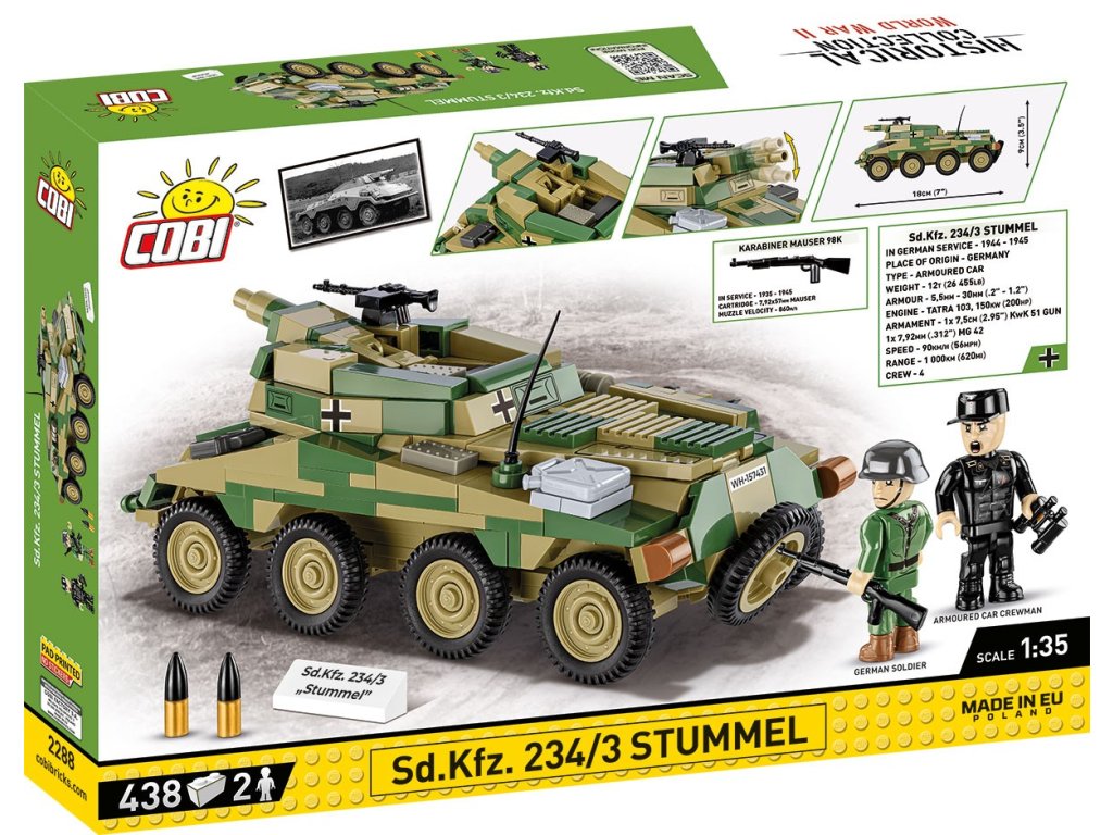 Postavte si model Sd. Kfz. 234/3 Stummel, německé obrněné kolové vozidlo používané během 2. světové války, v měřítku 1:35. Bylo vybaveno 75mm kanónem s rezervou 50 nábojů, díky čemuž bylo účinné proti ostatním obrněným vozidlům a lehce obrněným cílům. Vůz měl dieselový motor Tatra 103 a maximální rychlost až 90 km/h. V terénu si vedl téměř stejně dobře jako pásová vozidla. Balení obsahuje 438 kostek stavebnice a 2 figurky vojáků.