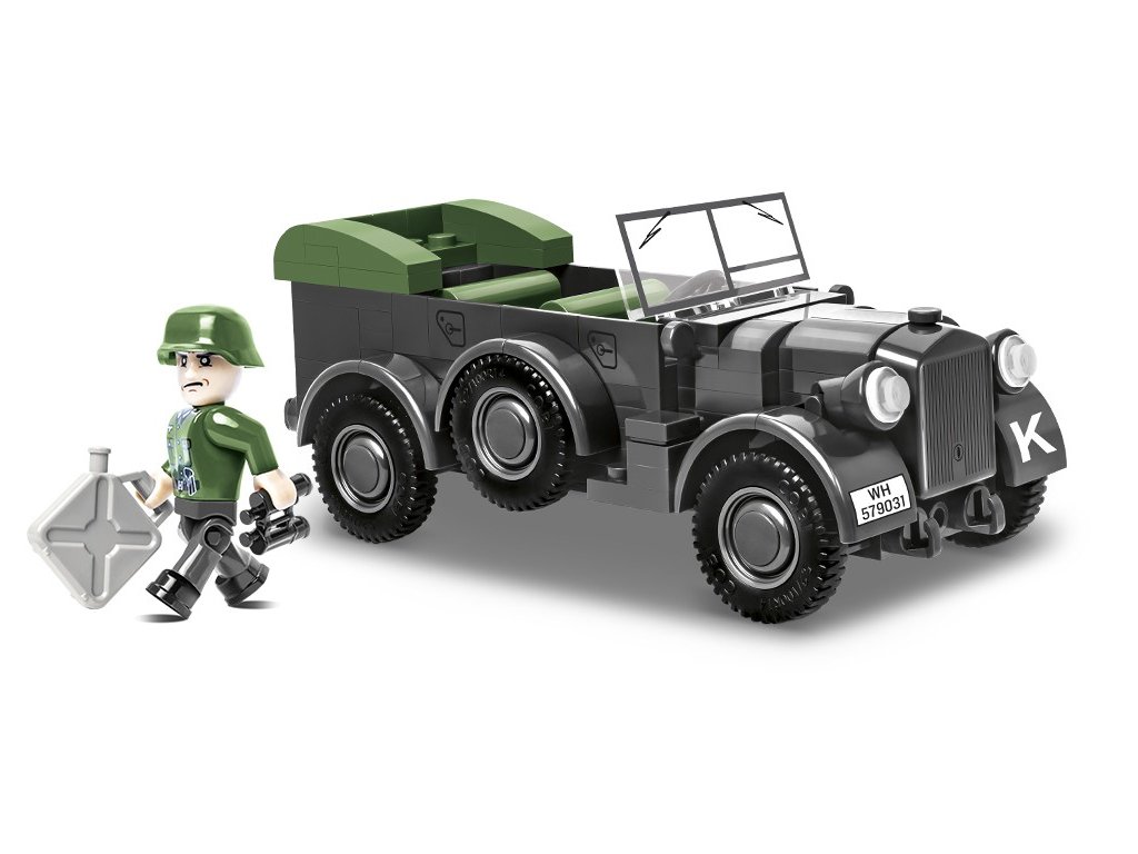 Postavte si model vojenského terénního vozidla Horch 901, používaného německými ozbrojenými silami v letech 1937 až 1945. Model je v měřítku 1:35. Balení obsahuje 185 kostek stavebnice a 1 figurku řidiče. Světlomety ve tmě svítí (fluorescenční kostky).
