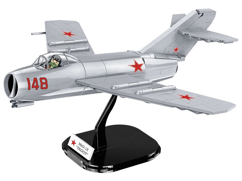 Postavte si model Mikojan MiG-15, prvního sériově vyráběného sovětského proudového stíhače. V kódu NATO byl označen jako „fagot“. Výroba proudových stíhaček byla velkým kvalitativním skokem v průmyslu SSSR. MIG-15 se brzy stal exportním hitem a využívaly ho jak země Varšavské smlouvy, tak i asijské a africké země. Stroje tohoto typu se zúčastnily mnoha konfliktů, největší slávu získaly během korejské války, kdy na obloze bojovaly s americkým protějškem F-86 „Saber“. Balení obsahuje 504 kostek stavebnice a 1 figurku pilota.