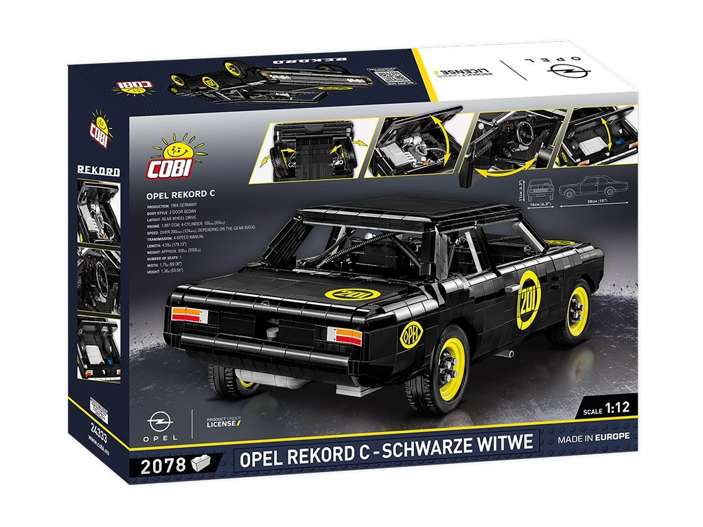 Postavte si model legendární model "Černé vdovy" v měřítku 1:12. Sestavený model měří na délku 38 cm! Čeká vás spousta překvapení: pohyblivý volant, kterým můžeme otáčet koly, panty pro otevírání dveří, dokonalá karoserie s ozdobnými prvky. Pod výklopnou kapotou je umístěn motor. Četné detaily, jako jsou kliky, světla a hodiny, vytvářejí dokonalý celek. Závodní číslo 201 je vytištěno na karoserii vozu, stejně jako další grafika, kvalitním stálobarevným tiskem. Už žádné samolepky! Balení obsahuje 2 078 kostek, neobsahuje figurky. Sportovní vůz Opel Rekord C je vyrobený pod licencí Opel.