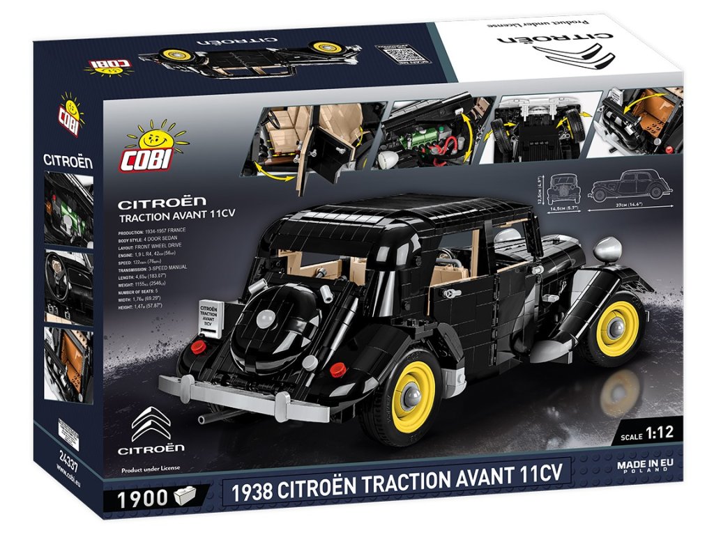 Citroën Traction Avant (česky přední náhon) byl první sériově vyráběný automobil s pohonem předních kol a samonosnou karoserií. Vyráběla jej francouzská automobilka Citroën v letech 1934 – 1957. Za tuto dobu bylo vyrobeno kolem 760 000 vozů v několika provedeních. Sestavený model měří 37 x 14,5 x 12,5 cm a je v měřítku 1:12. Balení obsahuje 1900 kostek stavebnice. Veškerá gafika je natištěna na kostkách, v balení nenajdete žádné samolepky. Vyrobeno pod licencí Citroen.