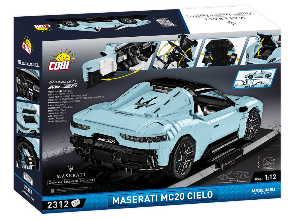 Maserati MC20 Cielo ukazuje dokonalost italského motorismu, je kombinací elegance, moderního designu a neuvěřitelné síly. Stavebnice Maserati MC20 Cielo v měřítku 1:12 je skutečnou lahůdkou pro každého motoristického a modelářského nadšence. Sada představuje Maserati ze super limitované edice "PrimaSerie" a z 2 312 přesných prvků stavebnice vám umožní postavit věrnou repliku jednoho z nejmodernějších vozů na světě.