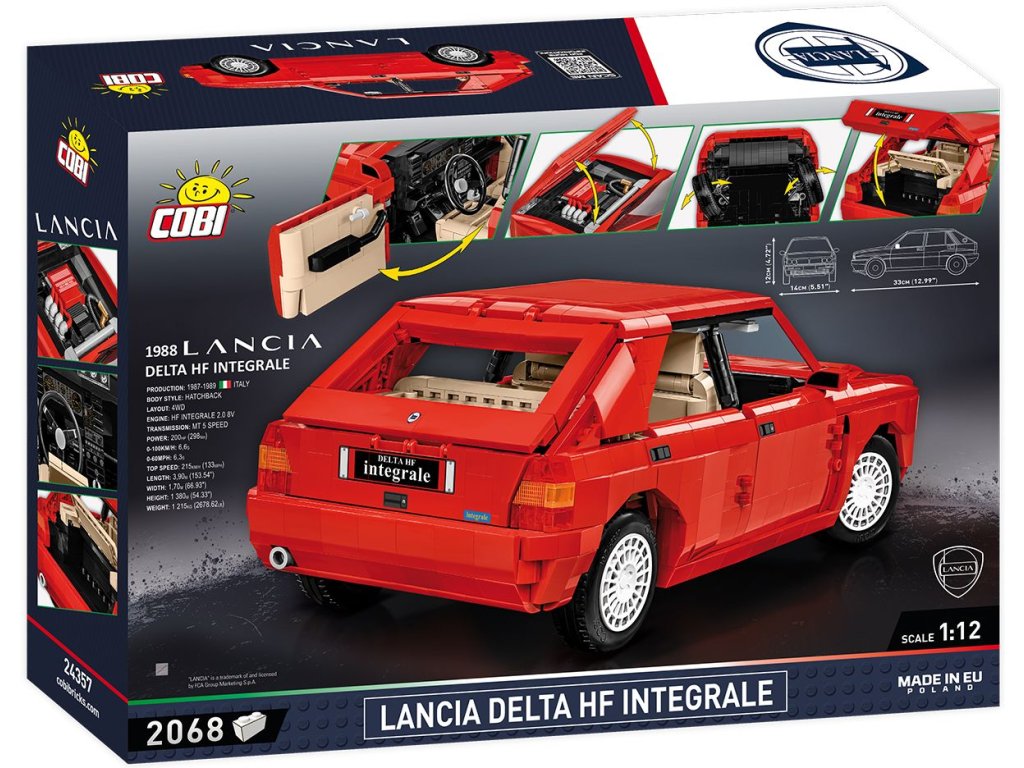 Model Lancia Delta HF Integrale je vynikající volbou pro každého, kdo ocení přesnou reprodukci všech detailů, funkčnost a kvalitu zpracování. Model je v měřítku 1:12 a sestavený měří na délku celých 33 cm! Balení obsahuje 2 068 kostek stavebnice. Vyrobeno v licenci Lancia.