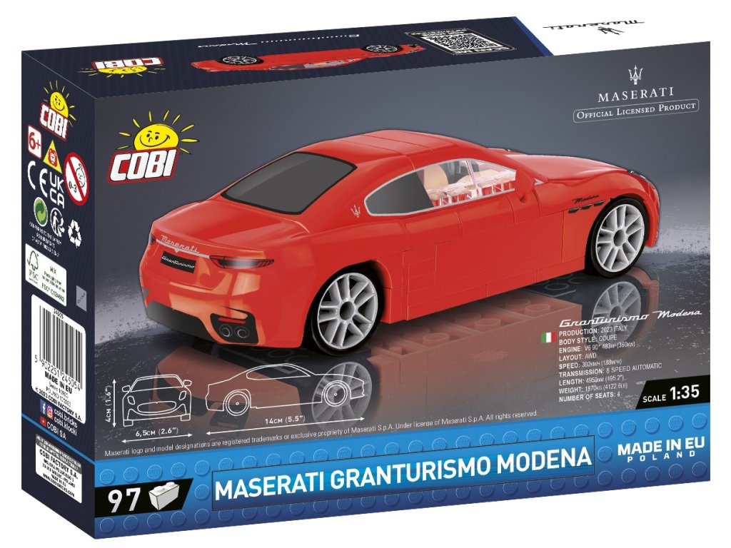 Model COBI GRANTURISMO MODENA v měřítku 1:35 je vyráběn na základě licence slavné italské automobilové značky Maserati. Je to ideální produkt pro děti i dospělé motoristické fanoušky. Díky speciálně navrženým kostkám, které věrně odrážejí tvar karoserie, a odolným, barevným potiskům vypadají vozidla vytvořená společností COBI jako malá umělecká díla. Model je ideální pro vystavení ve sbírce dospělého automobilového fanouška nebo do dětského pokoje. A díky své pevné konstrukci a pohyblivým kolům se speciálními gumovými pneumatikami je také perfektní hračkou.