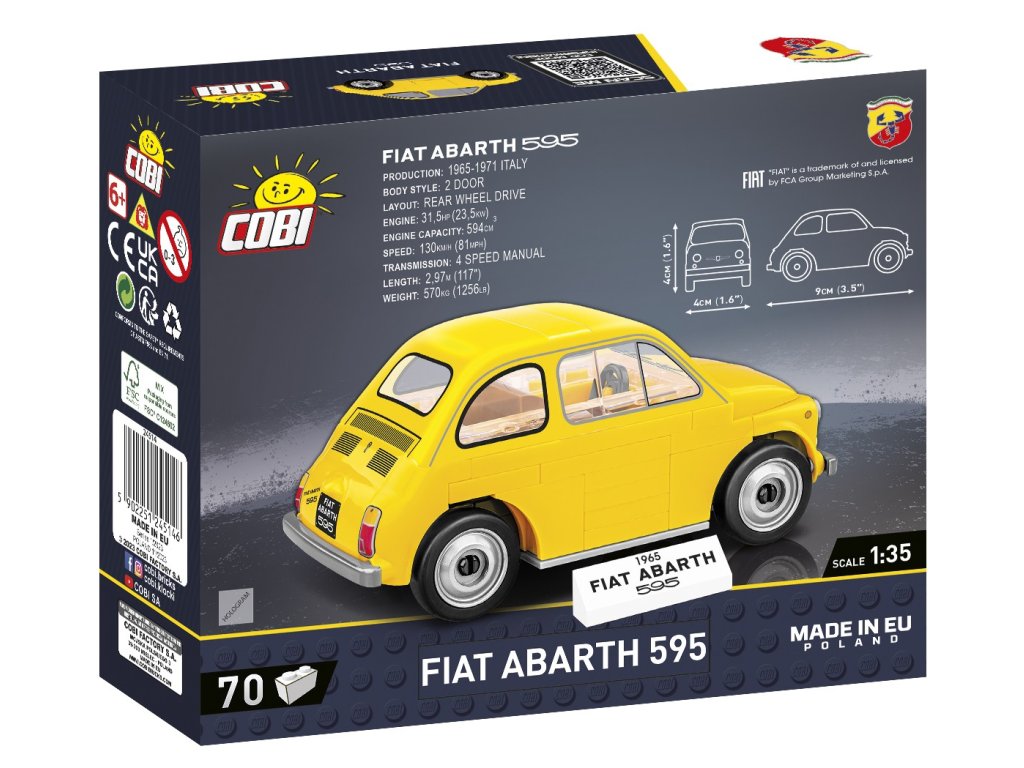 V roce 1965 společnost Abarth, specializující se na vylepšování vozů FIAT, upravila populární model 500 a uvedla na trh verzi Abarth 595. Náš model v měřítku 1:35 věrně odráží charakteristický tvar legendárního vozu. Sestavený model měří 9 cm x 4 cm x 4 cm. Balení obsahuje 70 kostek stavebnice.