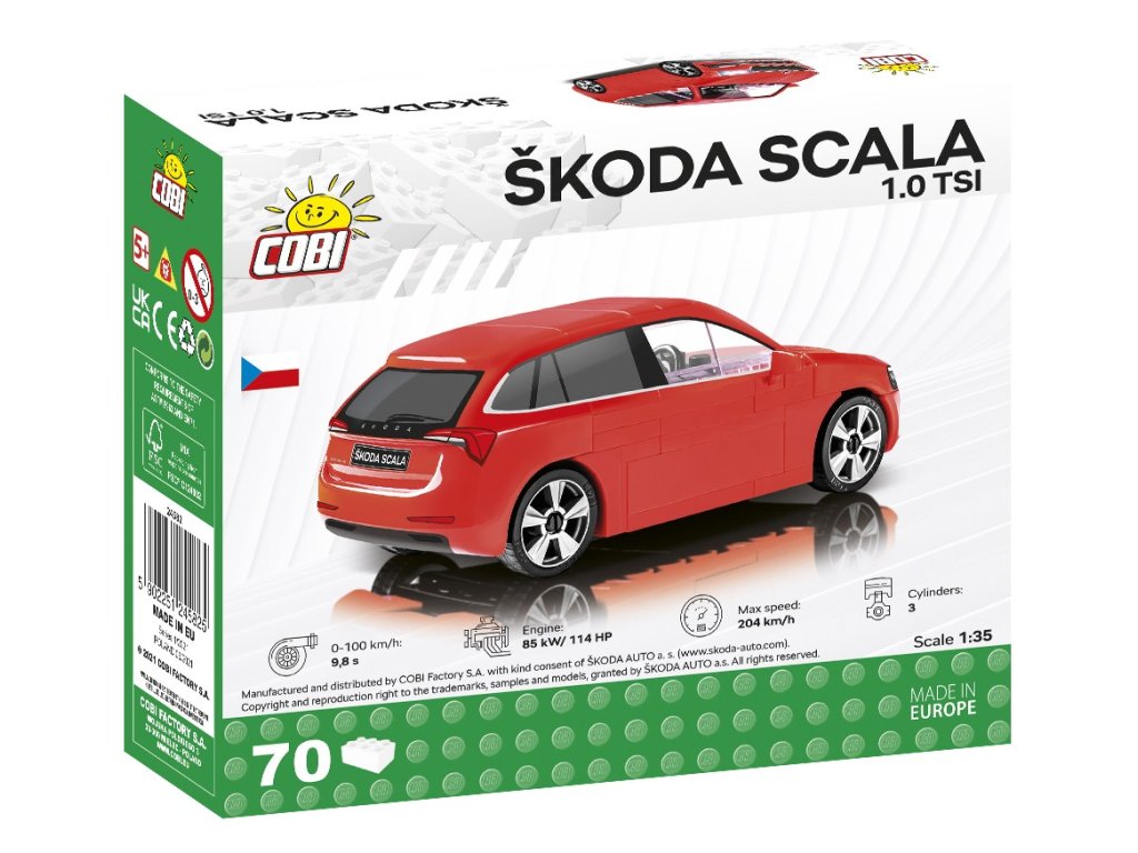 Postavte si model Škody Scala v měřítku 1:35. Sestavený model měří 12,5 x 6,5 x 4,5 cm. Balení obsahuje 70 kostek stavebnice. Neobsahuje figurky. Vyrobeno pod licencí Škoda.