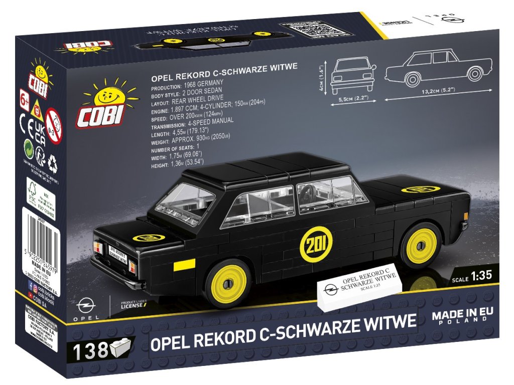 Postavte si automobilovou legendu a objevte jedinečnou historii sportovní verze Opelu Rekord C, zvaného Černá vdova. Model je v měřítku 1:35 a sestavený měří 13,2 cm x 5,5 cm x 4 cm. Balení obsahuje 138 kostek stavebnice.