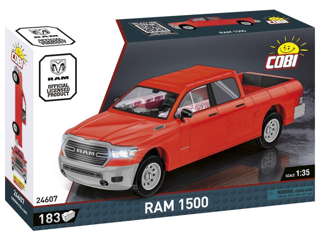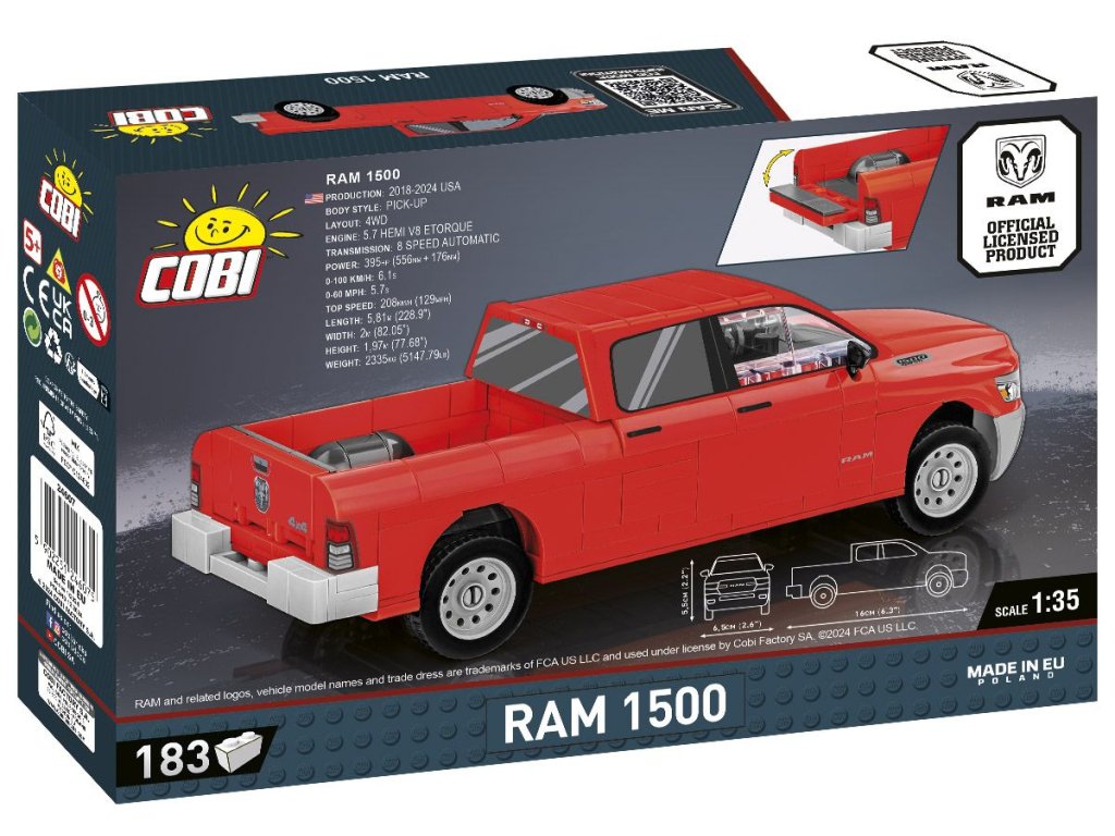 Postavte se model amerického RAM 1500 v měřítku 1:35. Sestavený model měří 16 × 6,5 × 5,5 cm. Balení obsahuje 183 kostek stavebnice. Vyrobeno v licenci RAM.