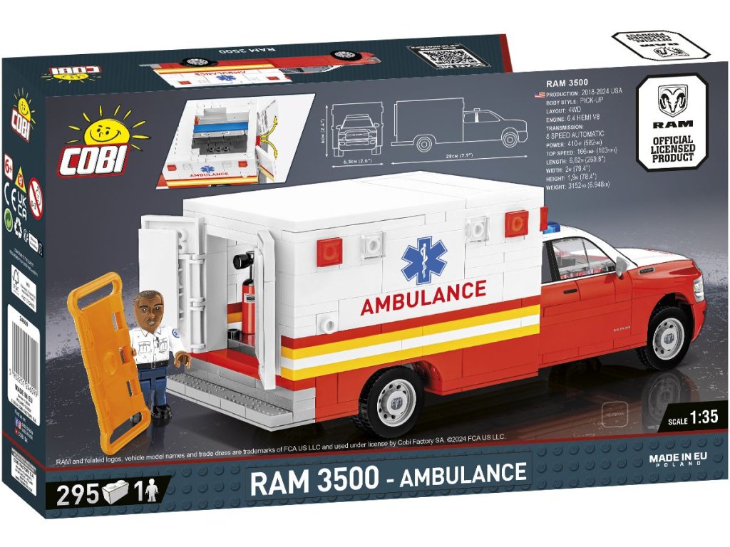 Ambulance RAM 3500 je moderní sanitní vůz vybavený detaily jako je světelná signalizace, záchranářský interiér a červenobílé barevné schéma. Postavte si její model v měřítku 1:35 z 295 kostek stavebnice. Sada obsahuje figurku zdravotníka s nosítky. Vyrobeno v licenci RAM.