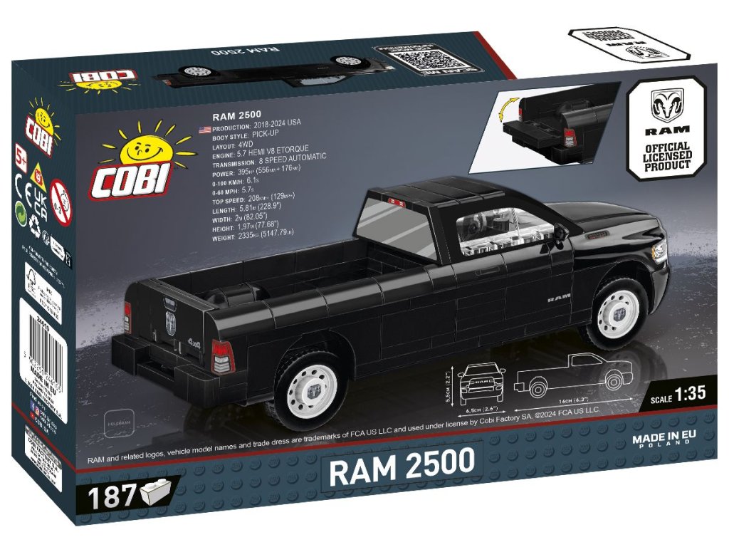 Model pick-upu RAM 2500 z kostek je postaven v měřítku 1:35 a obsahuje 187 kostek stavebnice. Nabízí robustní design, funkční kola a realistickou kabinu.
