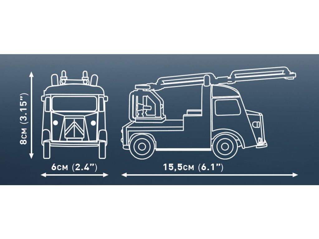 Postavte si model Ikonického francouzského hasičského vozu Citroën Type H Pompiers v měřítku 1:35. Sestavený model měří 15,5 x 6 x 8 cm. Balení obsahuje 210 kostek stavebnice. Vyrobeno v licenci Citroen.