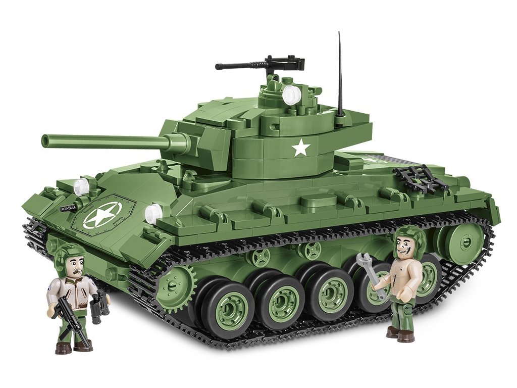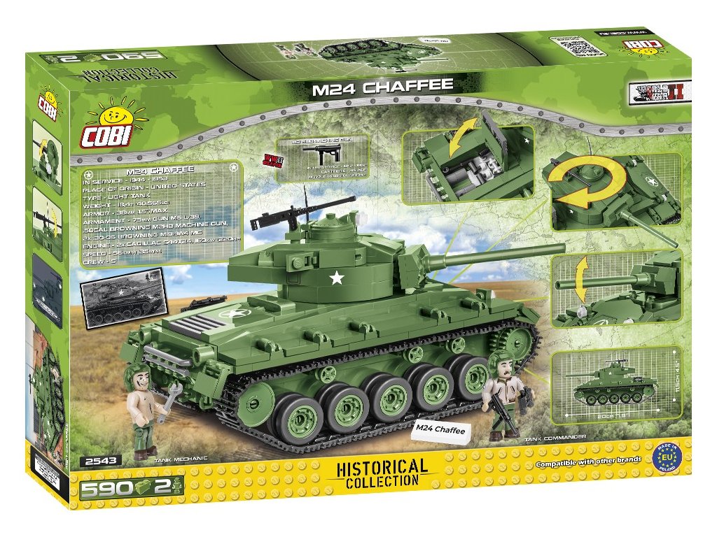 M24 Chaffee je americký lehký tank z 2. světové války. V letech 1944-1945 bylo vyrobeno 4731 kusů. Úspěšně nahradil další lehký tank M3/M5 Stuart. Chaffee byl vybaven svařeným pancířem, dvěma motory a 75mm kanónem, který byl dříve navržen pro bombardér B-25 Mitchell. Byl to první západní spojenecký tank, který použil torzní tyče jako závěsy. Stalo se, že vojáci zahájili palbu na své vlastní tanky, protože podvozek Chaffee připomínal německý Panzer II a Panther. Tank byl použit v bitvách ve Francii, Itálii a Třetí říši. Po válce zůstal ve službách amerických vojsk. Byl velmi populární po celém světě. M24 byl také použit v korejské válce. Stroje patřící Francii bojovaly v Indočíně a Alžírsku. Ve vietnamské válce je používala jihovietnamská armáda. V balení najdete 590 kostek stavebnice a 2 figurky vojáků.