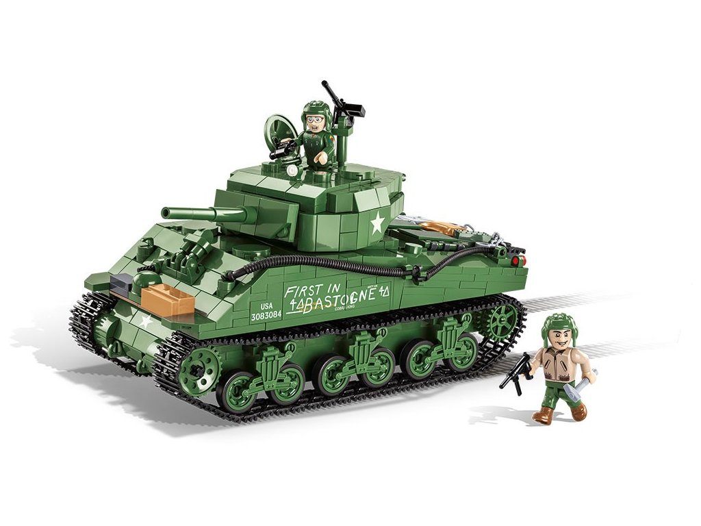 Postavte si model Shermanu M4A3E2 „Jumbo“, což byla krátká série dobře obrněných tanků o pouhých 254 jednotkách. Sherman byl obvykle vyzbrojen 75 mm kanónem, namontovaným na upravené lafetě M62. Jumbo, vlastním jménem „Cobra King“, dostal 76mm kanón i koaxiální kulomet. Byl vydán 37. tankovému praporu 4. tankové divize na konci října 1944 a byl tankem velitele roty C. Proslavil se v zimě 1944 v Ardenách, kde jako první prolomil německé linie a dostal se k vojákům 101. výsadkové divize. Na památku této významné události namalovala posádka tanku grafiti, které najdete i na našem modelu. Balení obsahuje 720 kostek stavebnice a 2 figurky vojáků.