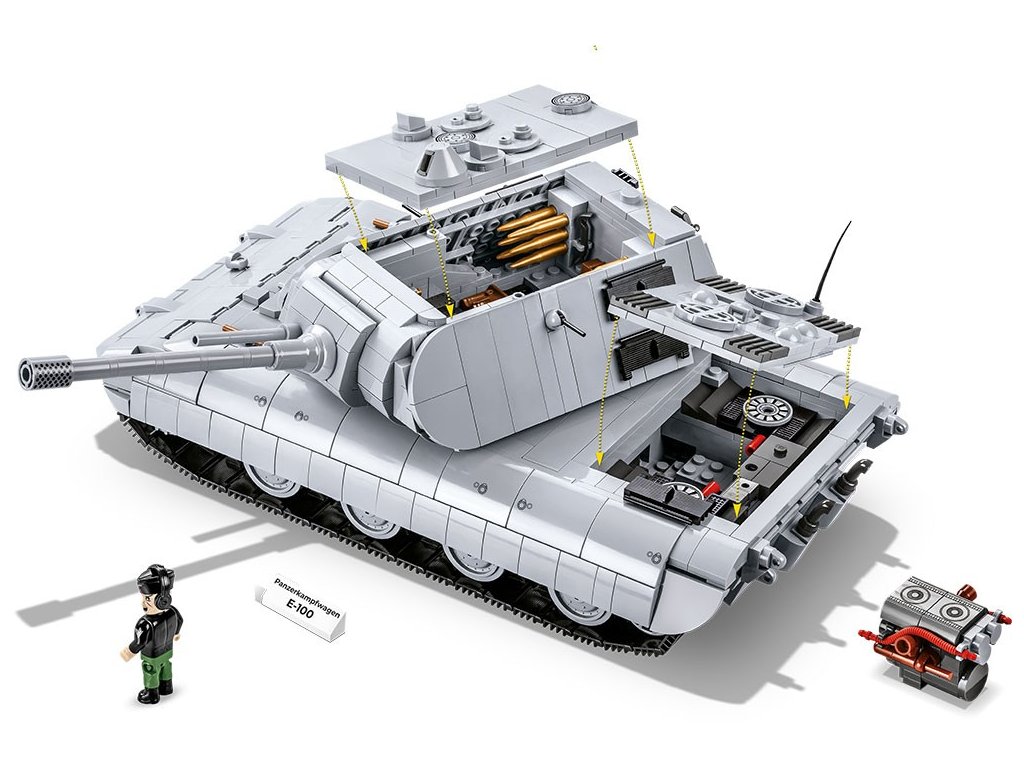 Postavte si model Panzerkampfwagen E-100. Jedná se o poněkud záhadný německý prototyp supertěžkého tanku vyvinutý v závěrečných fázích 2. světové války. Vozidlo bylo navrženo v rámci programu Entwicklungsserie (proto označení E), zaměřeného na vývoj řady obrněných vozidel různých typů, případně zjednodušených a založených na používaných standardech. Náš model Panzerkampfwagen E-100 byl vyvinut ve velkém měřítku 1:28 a měří 37 cm na délku! Balení obsahuje 1 511 kostek stavebnice a 1 figurku vojáka.