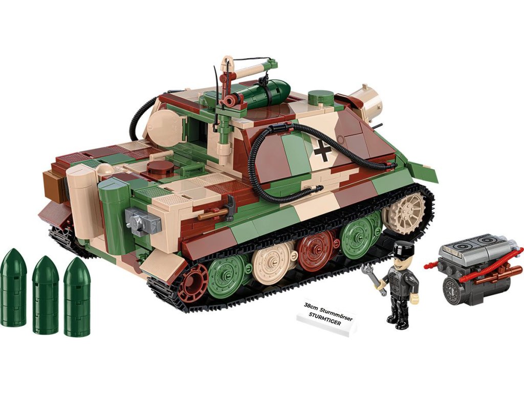 Sturmtiger bylo německé obrněné dělo z 2. světové války. Náš model byl navržen v měřítku 1:28 a skládá se z 1100 vysoce kvalitních kostek stavebnice. Balení obsahuje také figurku mechanika. Sestavené vozidlo měří 23 x 13 x 13,5 cm.