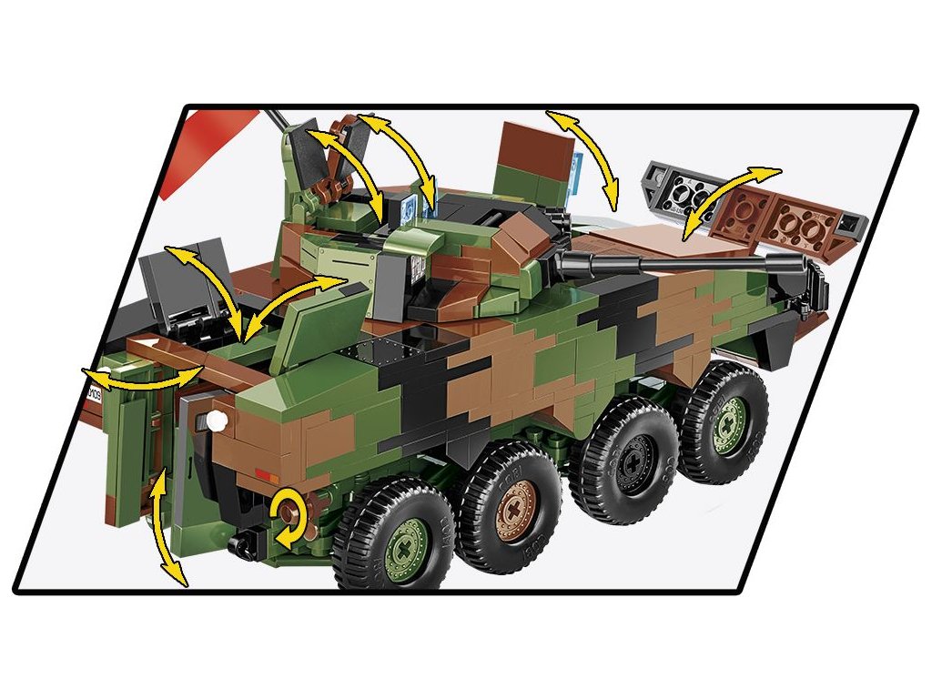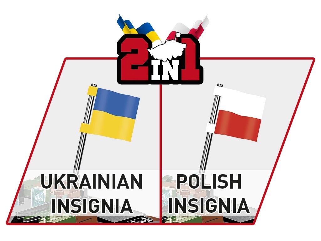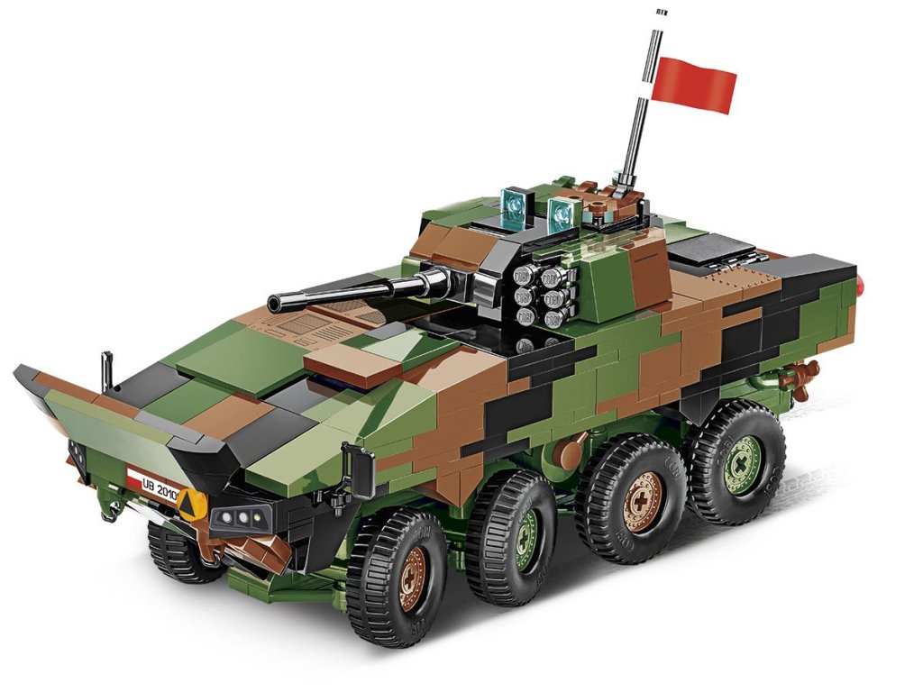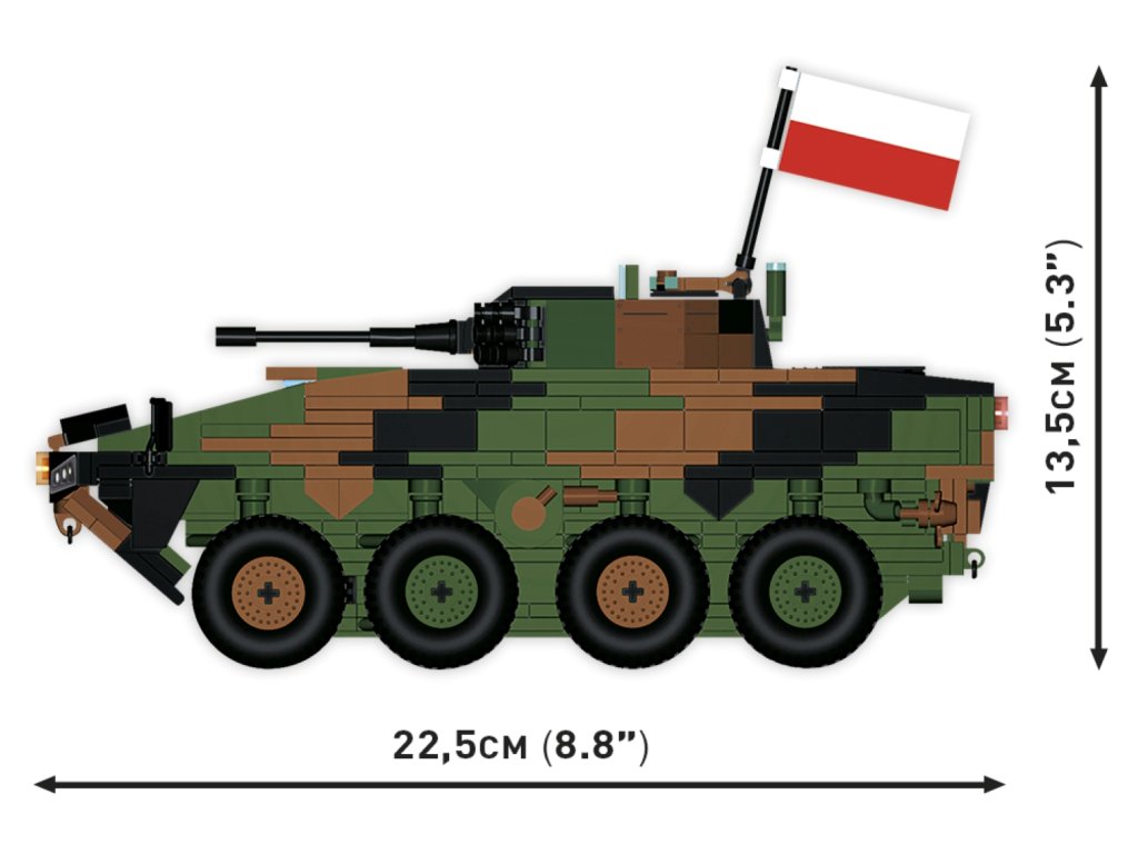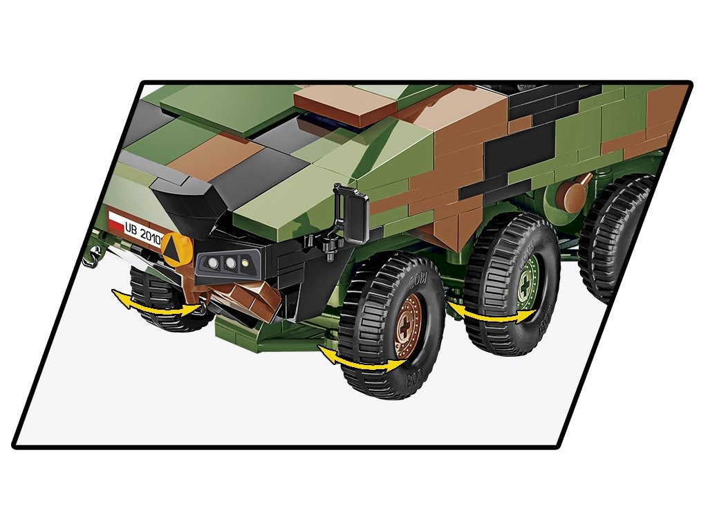 Náš model, detailně zpracovaný v měřítku 1:35, dokonale doplňuje sbírku pozemních vozidel vydaných v rámci série COBI Armed Forces (Ozbrojené síly). Sada byla vydána v licenci společnosti ROSOMAK SA ze Siemianowic Śląskie, kde se vyrábí originální vozidlo. Model má řiditelné nápravy kol, otevírací poklopy a tištěné detailní označení polské armády. Sada obsahuje také dvě vlajky zemí, které tento typ vozidla používají (Polsko a Ukrajina). Plaketu s vytištěným názvem vozidla lze umístit vedle modelu. Postavte si s COBI moderní kolový transportér polské armády ještě dnes!