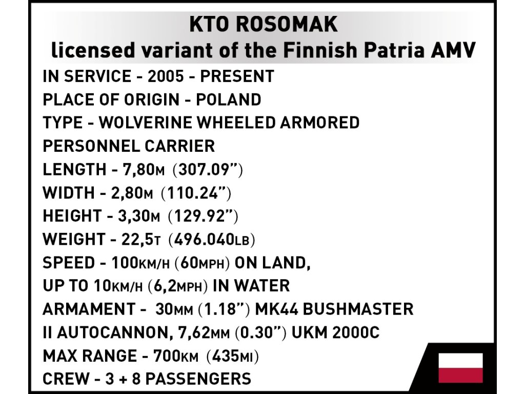 KTO Rosomák je hlavní bojové vozidlo polských pozemních sil, které se vyznačuje vysokou mobilitou, pevným pancéřováním a všestrannými zbraněmi. Model je v měřítku 1:35 a měří 22,5 x 10 x 13,5 cm. Má mnoho funkčních částí. Balení obsahuje 666 kostek stavebnice. Vyrobeno v licenci Rosomak SA.
