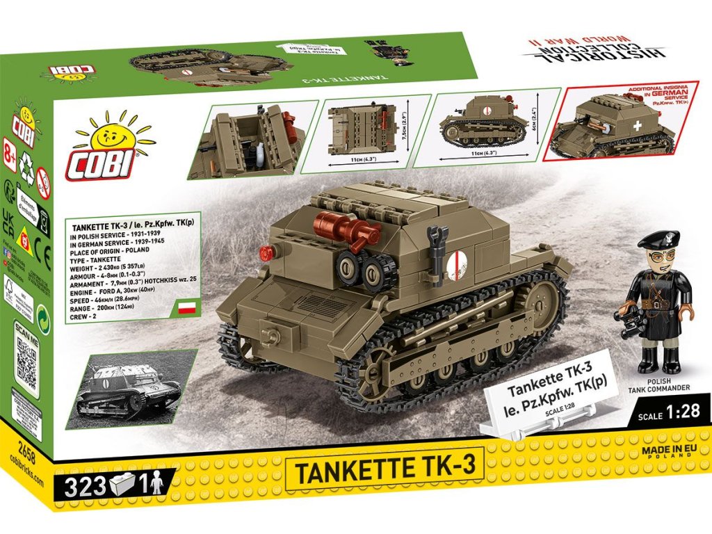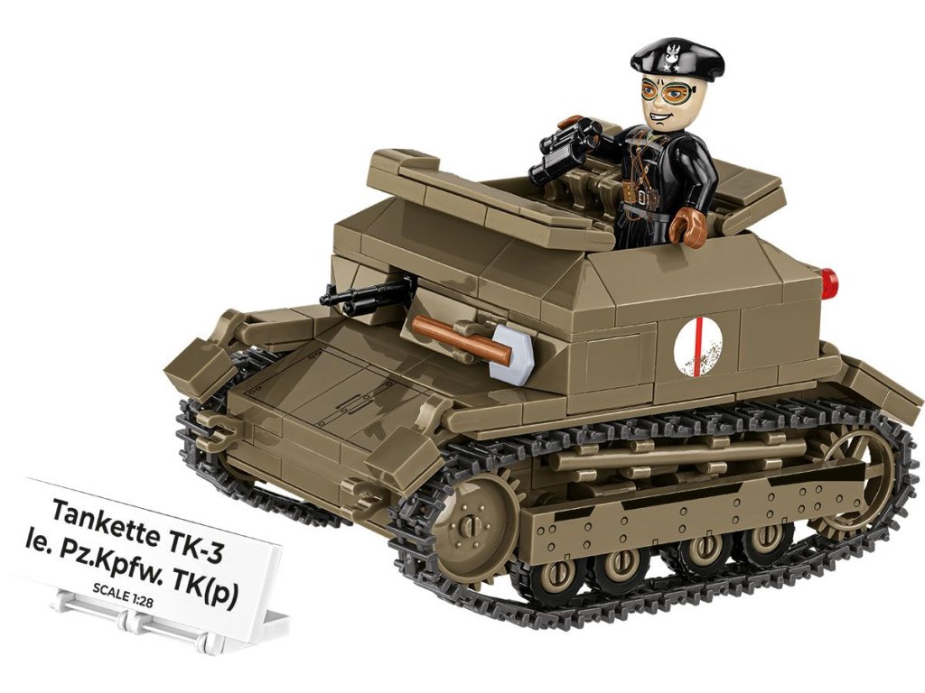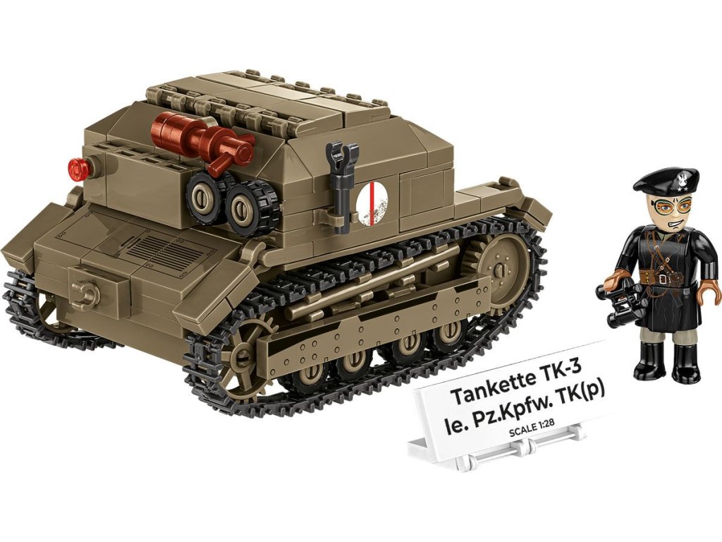 Lehký tank TK-3, jedno z prvních polských obrněných vozidel, sehrál důležitou roli v zářijovém tažení roku 1939, podporoval pěchotu a plnil průzkumné úkoly. Model je v měřítku 1:28 a měří 11 x 7,5 x 6 cm. Má mnoho funkčních částí. Balení obsahuje 323 kostek stavebnice a figurku vojáka.
