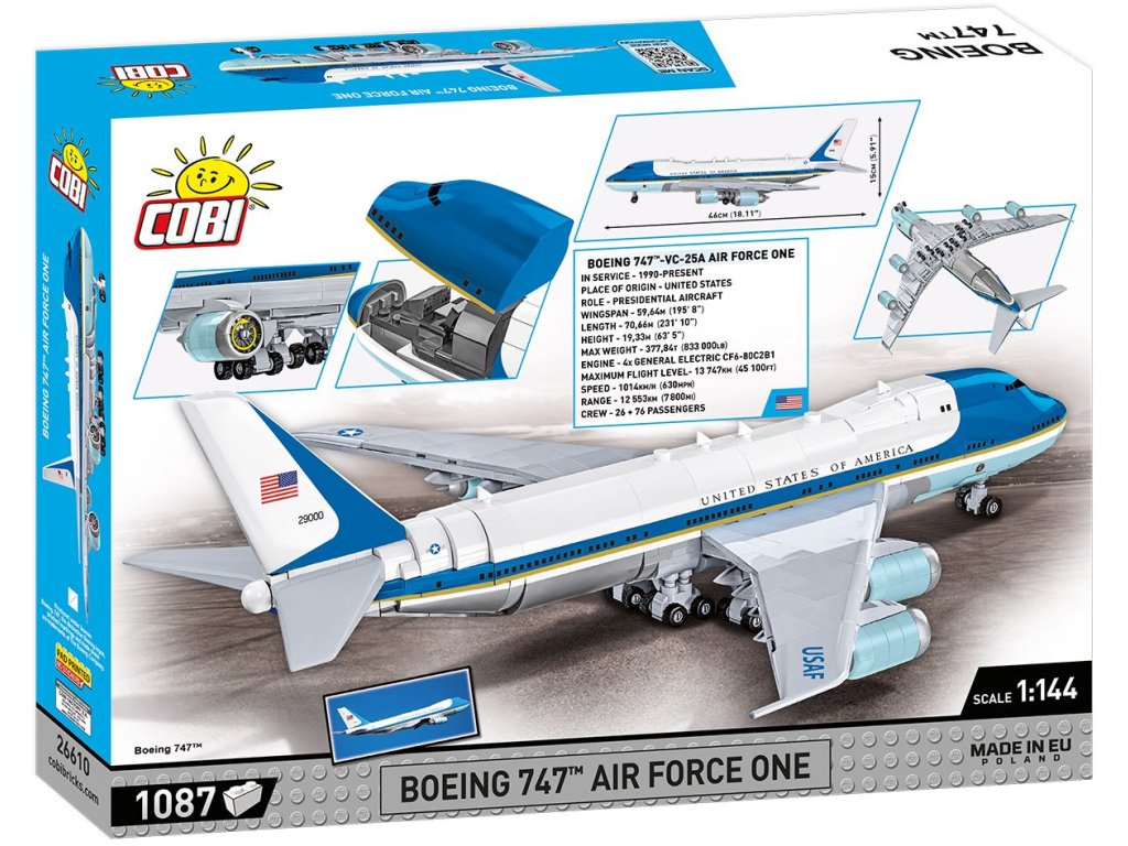 Postavte si model amerického prezidentského speciálu Air Force One. Model nejdůležitějšího jumbo jetu na světě se skládá z 1087 kostek stavebnice a je v měřítku 1:144. Po sestavení je letadlo dlouhé 46 cm a má rozpětí křídel 42 cm.