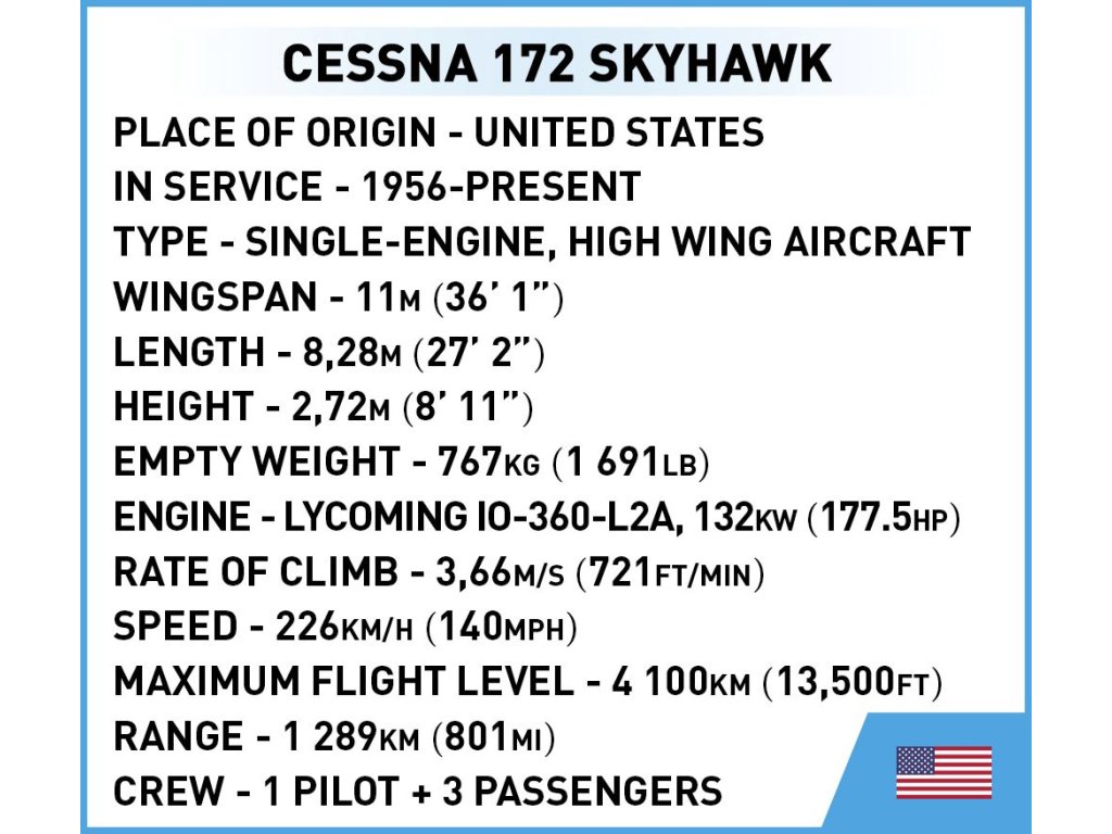 Cessna 172 Skyhawk je jednomotorové, čtyřmístné turistické a cvičné letadlo vyráběné společností Cessna Aircraft Company. Model jsme navrhli s důrazem na detail v měřítku 1:48 s použitím 160 prvků. Jeho velikost dokonale zapadá do sbírky našich moderních letadel. Model má otočná kola a pohyblivou vrtuli. Na kostkách jsou pouze potisky, žádné samolepky! Speciálně pro tuto sadu jsme navrhli nový tvar kostky - vertikální stabilizátor - aby náš model co nejrealističtěji zpodobňoval originální letoun. Stavba sady je jednoduchá a bezproblémová díky přehlednému ilustrovanému návodu. Cessna 172 Skyhawk je model, který musí mít nadšenci do civilního letectví. Vezměte si svou vášeň domů a postavte si ho!