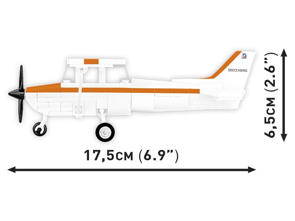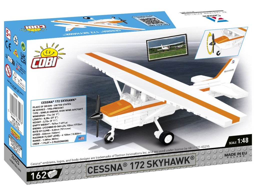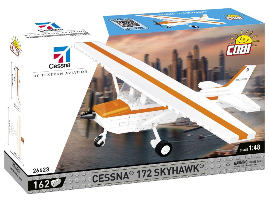 Cessna 172 Skyhawk je jednomotorové, čtyřmístné turistické a cvičné letadlo vyráběné společností Cessna Aircraft Company. Model je v měřítku 1:48 a postavíte ho ze 162 kostek stavebnice. Sestavený model měří 17,5 x 23,5 x 6,5 cm.