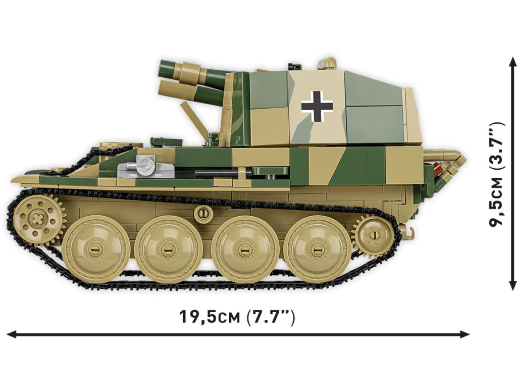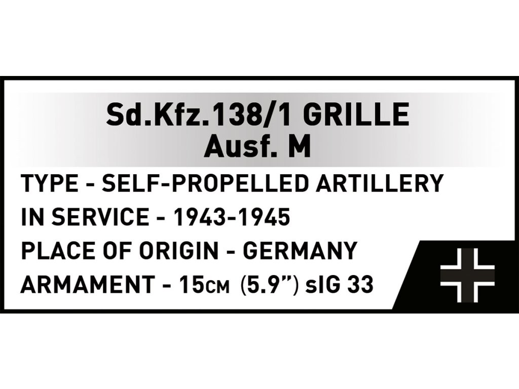 Postavte si model německé samohybné houfnice Sd.Kfz. 138/1 Grille Ausf. M z 2. světové války v měřítku 1:28. Sestavený model měří 19,5 x 8,5 x 9,5 cm. Má mnoho funkčních částí. Balení obsahuje 720 kostek stavebnice a figurku německého dělostřeleckého důstojníka v historické uniformě.