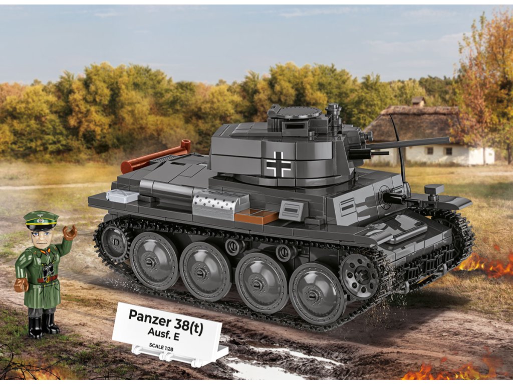 Dvě tváře jednoho tanku: československý lehký tank LT vzor 38 a Panzer 38(t) v jedné sadě od COBI! Postavte si model tohoto tanku z 2. světové války v měřítku 1:28. Sestavený model měří 17,5 x 8 x 9 cm. Má mnoho funkčních částí. Balení obsahuje 690 kostek stavebnice a figurku německého generála.