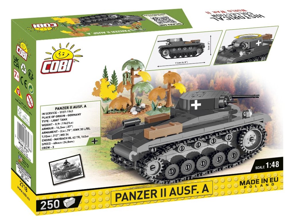 Panzerkampfwagen II je německý lehký tank používaný v prvních letech 2. světové války. Do roku 1941 byl základním tankem u obrněných divizí. Od roku 1942 kvůli slabosti výzbroje ztratil na významu. Sloužil k průzkumným a protipartyzánským úkolům. Bylo vytvořeno několik verzí PzKpfw II, které byly používány až do konce války. Náš model je v měřítku 1:48 a sestavený měří 11 x 5 cm. Balení obsahuje 250 kostek stavebnice, neobsahuje figurky. Najdete v něm také prvky prostředí použitelné pro stavbu scének.