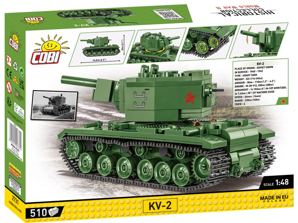 Postavte si model KV-2, sovětského těžkého tanku z 2. světové války. Model je v měřítku 1:48 a měří 16,5 x 7,5 x 8 cm. Má mnoho funkčních částí. Balení obsahuje 510 kostek stavebnice.
