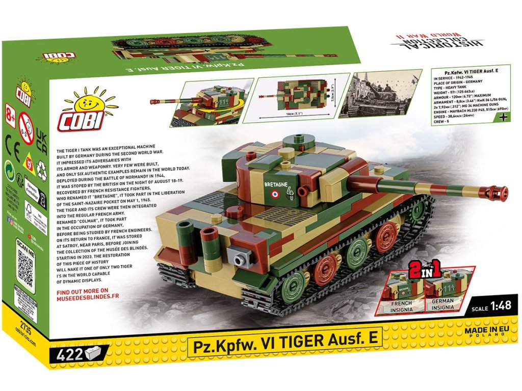 Postavte si model tanku Tiger I číslo 114, který urazil dlouhou cestu - od front 2. světové války až po exponát v Musée des Blindés ve Francii. A právě ve spolupráci s tímto muzeem vznikl náš model. Model je v měřítku 1:48 a měří 18 x 7,5 x 6 cm. Má mnoho funkčních částí. Balení obsahuje 422 kostek stavebnice.