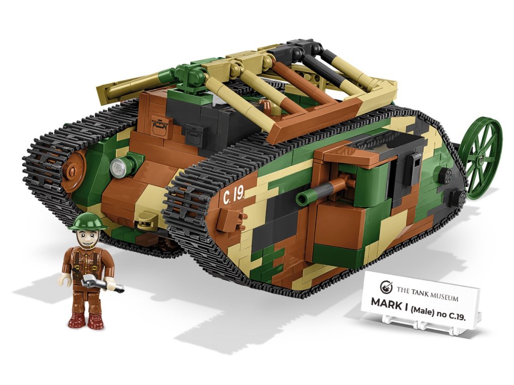 První světová válka zahájila éru ocelových slonů, která trvá dodnes. Tehdy se zrodil design jednoho z prvních tanků: MARK I (Male) číslo C.19. Prototyp všech budoucích tanků si můžete postavit z 878 kostek stavebnice. Model měří 28 cm na délku a díky použití měřítka 1:35 se do modelu vejdou figurky COBI. Tank je vybaven funkčními pásy, otočnými kanóny a otevíracími klapkami. Značení a emblémy jsou vyrobeny z barevných kostek s odolnými stálobarevnými potisky, které se neopotřebovávají ani při intenzivním používání. Sada obsahuje figurku britského tankisty z období 1. světové války a plaketu s názvem sady a logem Tankového muzea v Bovingtonu ve Velké Británii, které vlastní původní tank. A právě ve spolupráci s tímto muzeem vznikl náš model.