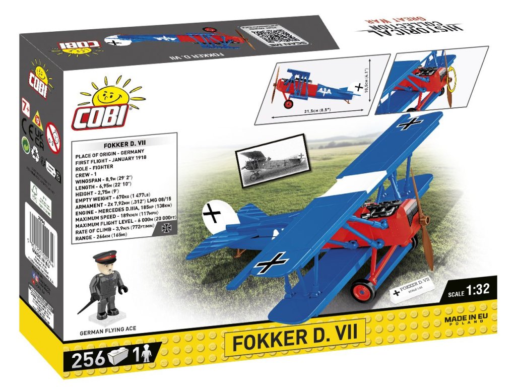 Postavte si model letounu Fokker D.VII z 1. světové války. Model je v měřítku 1:32 a měří 21,5 x 27 x 10,5 cm. Má mnoho funkčních částí. Balení obsahuje 256 kostek stavebnice a figurku pilota Rudolfa Bertholda.