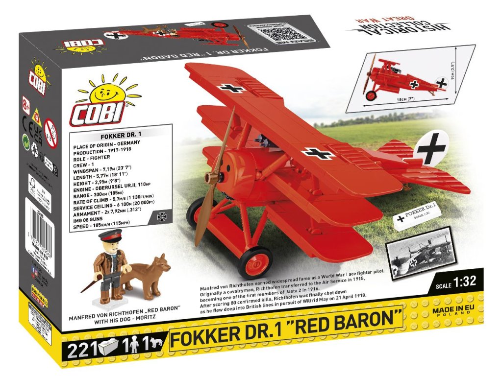Model od COBI je postaven z 221 kostek stavebnice v měřítku 1:32. V sadě najdete také figurku pilota Rudého barona v dobové uniformě a jeho psa. Letoun má pohyblivou vrtuli, realistická křídla, kolový podvozek a mnoho tištěných detailů, které podtrhují jeho historický charakter.
