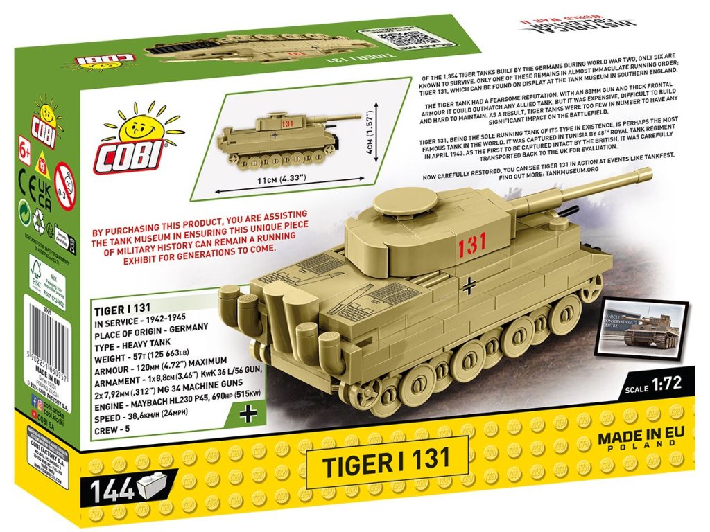Postavte si model tanku Tiger číslo 131 v měřítku 1:72. Jediný dochovaný a funkční německý tank Tiger na světě z 2. světové války se nachází v The Tank Museum v Bovingtonu (Velká Británie). Balení obsahuje 144 kostek stavebnice.