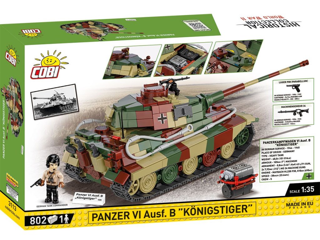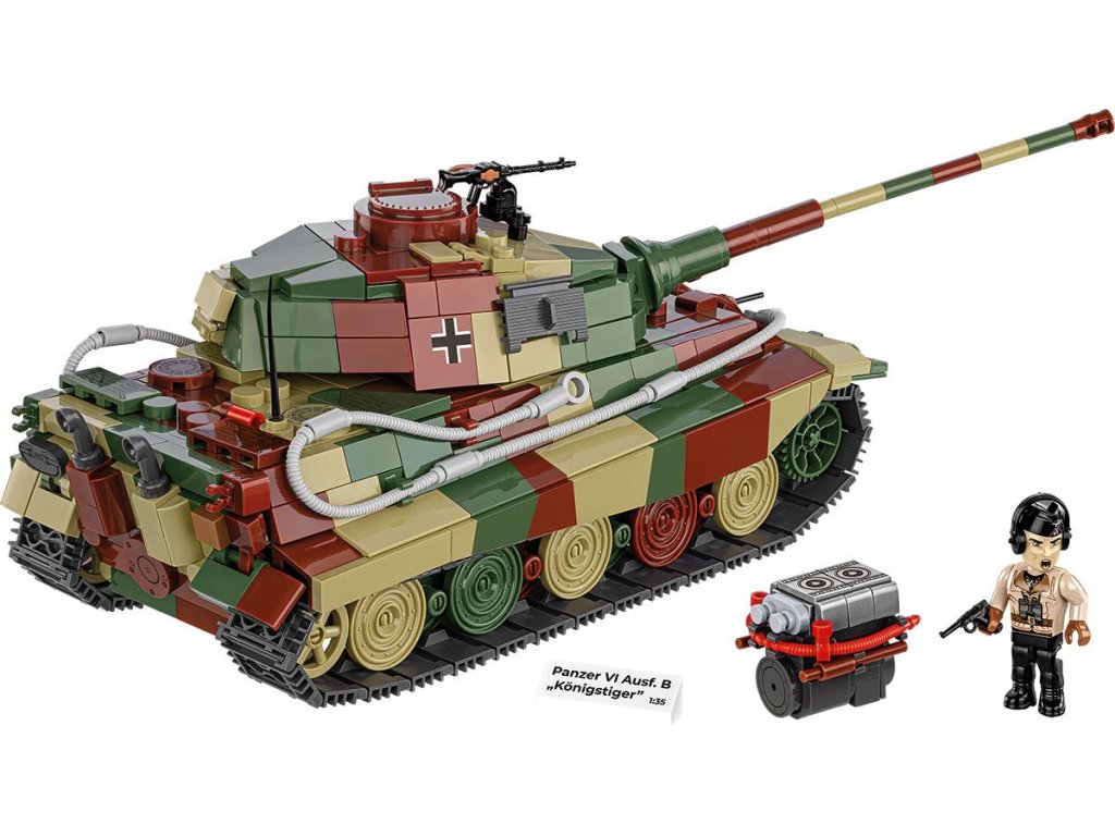 Tiger II, známý také jako Königstiger (Královský tygr), byl německý těžký tank používaný během 2. světové války. Poprvé v nabídce COBI byl největší Tygr navržen v měřítku 1:35 a dostal barevnou kamufláž charakteristickou pro závěrečné období války. Model má pohyblivá kola, funkční pásy, otočnou věž s pohyblivým kanónem, poklop, do kterého lze umístit figurku, odnímatelný motor a mnoho dalších detailů!