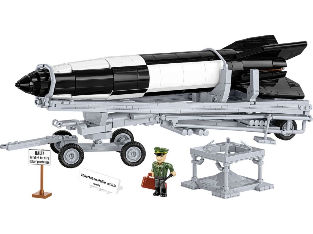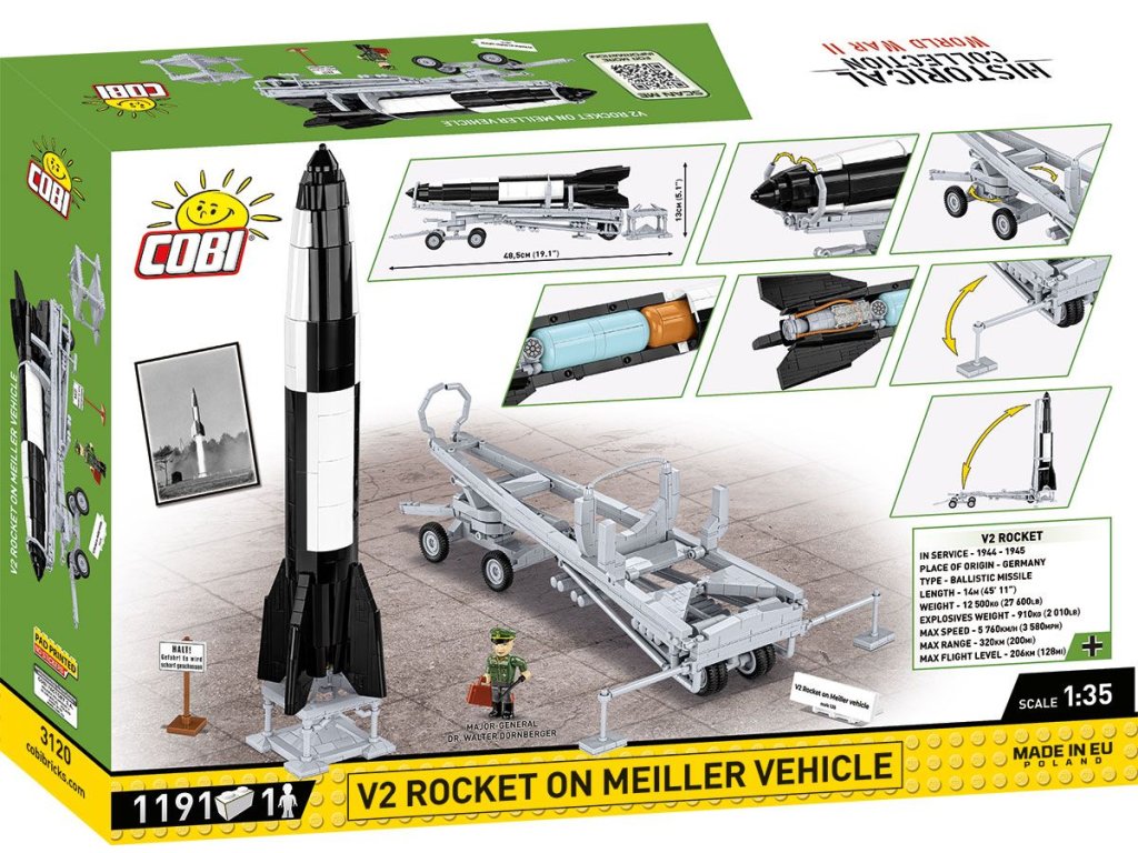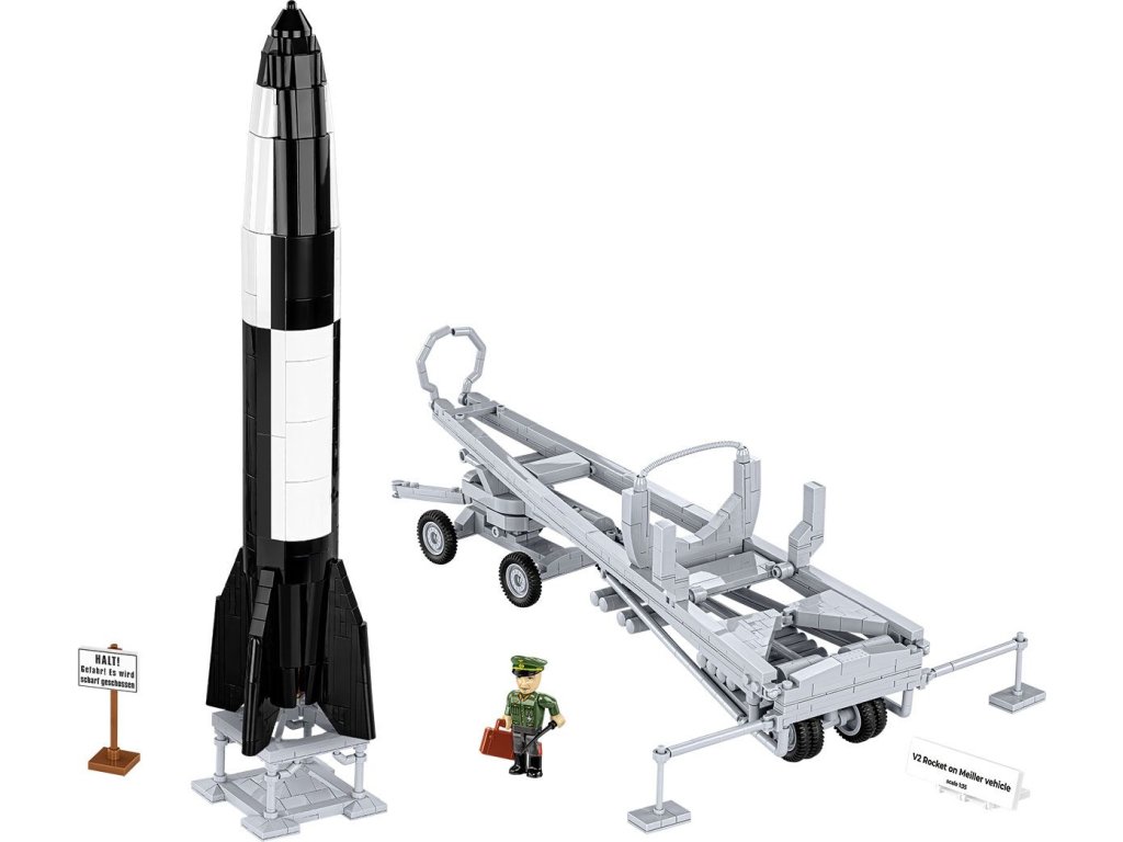 Raketa V2 je jednou z nejznámějších tzv. zázračných zbraní „Wunderwaffe“, které měly zvrátit průběh války. Tato konstrukce stále fascinuje mnoho nadšenců do historie a 2. světové války. Na přání fanoušků zde je legendární raketa V2 v měřítku 1:35, doplněná o další kostky. Samotná raketa má odnímatelný kryt, pod kterým se nachází interiér: výkonný raketový motor, palivová nádrž a hlavice s výbušninou!
