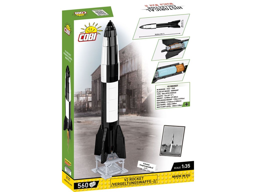 Postavte si model rakety V2 z 2. světové války. Model je v měřítku 1:35 a měří 38,5 x 8 x 8 cm. Má mnoho funkčních částí. Balení obsahuje 560 kostek stavebnice.