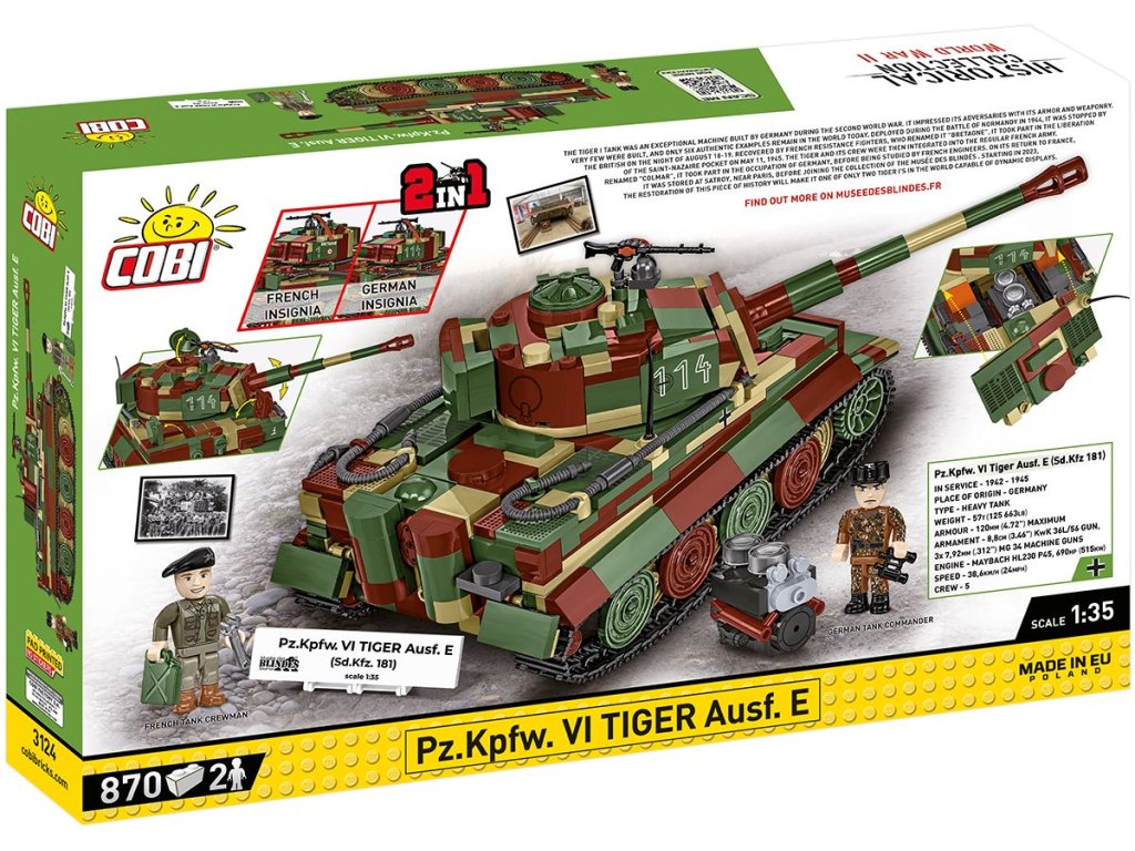 Tiger I byl německý těžký tank používaný během 2. světové války. Byl známý svou silnou výzbrojí a pancéřováním. Verze Ausf. E je jednou z nejikoničtějších variant tohoto stroje. Skutečný Tiger, který inspiroval tuto stavebnici, je součástí sbírek slavného Musée des Blindés ve francouzském Saumuru – a je jediným plně funkčním exemplářem na světě!