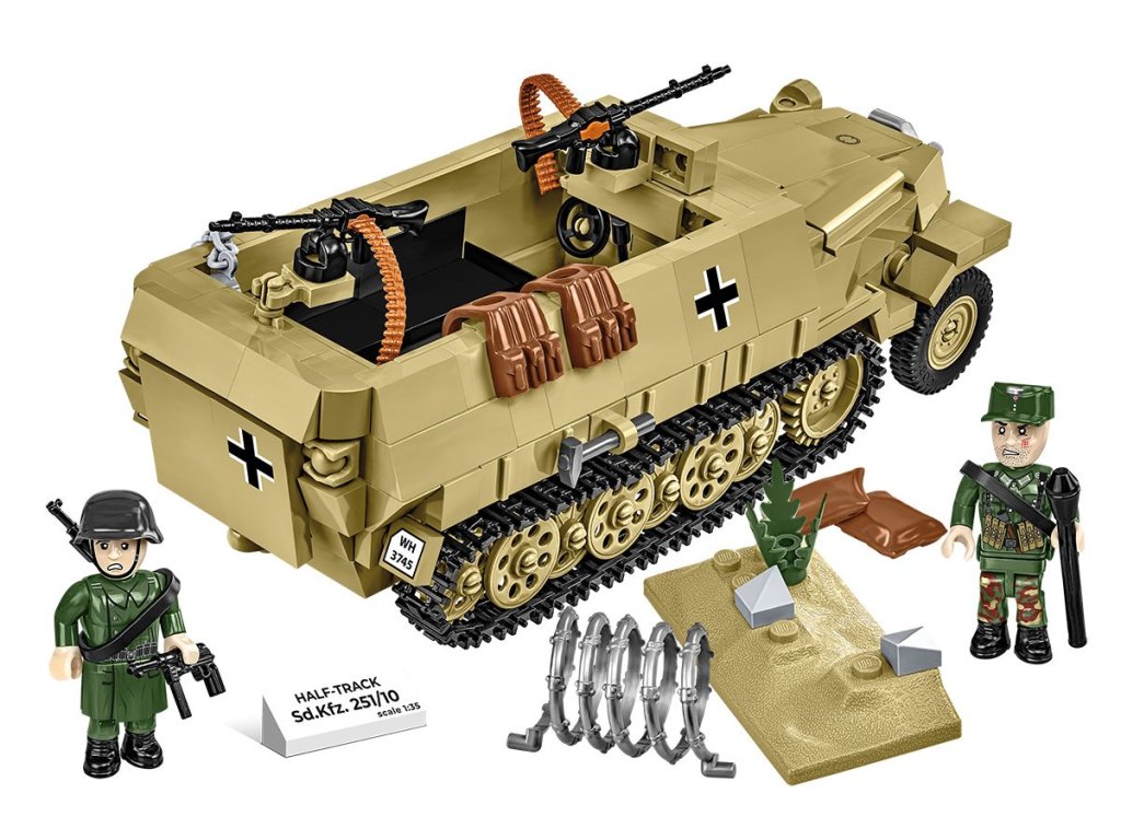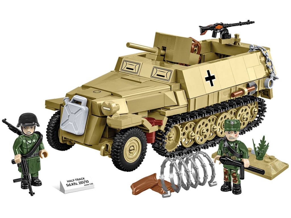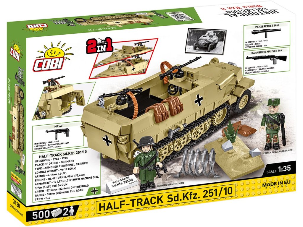 Sd.Kfz. 251 je polopásový obrněný transportér používaný německou armádou během 2. světové války. Vyráběl se od roku 1939 v různých modelech a verzích a sloužil k přepravě vojáků a stavbě bojových vozidel. Pancéřovaný trup chránil posádku a motor, a zadní dveře umožňovaly snadný přístup do interiéru. Model COBI 2v1 umožňuje vybavit transportér kanónem Pak 36 nebo puškami MG 34. Model má realistickou pásovou trakci, pohyblivá kola s pneumatikami, otevírací dveře a odolné stálobarevné potisky. Sada obsahuje figurky vojáků s vybavením, včetně granátometu Panzerfaust a pušky Mauser.