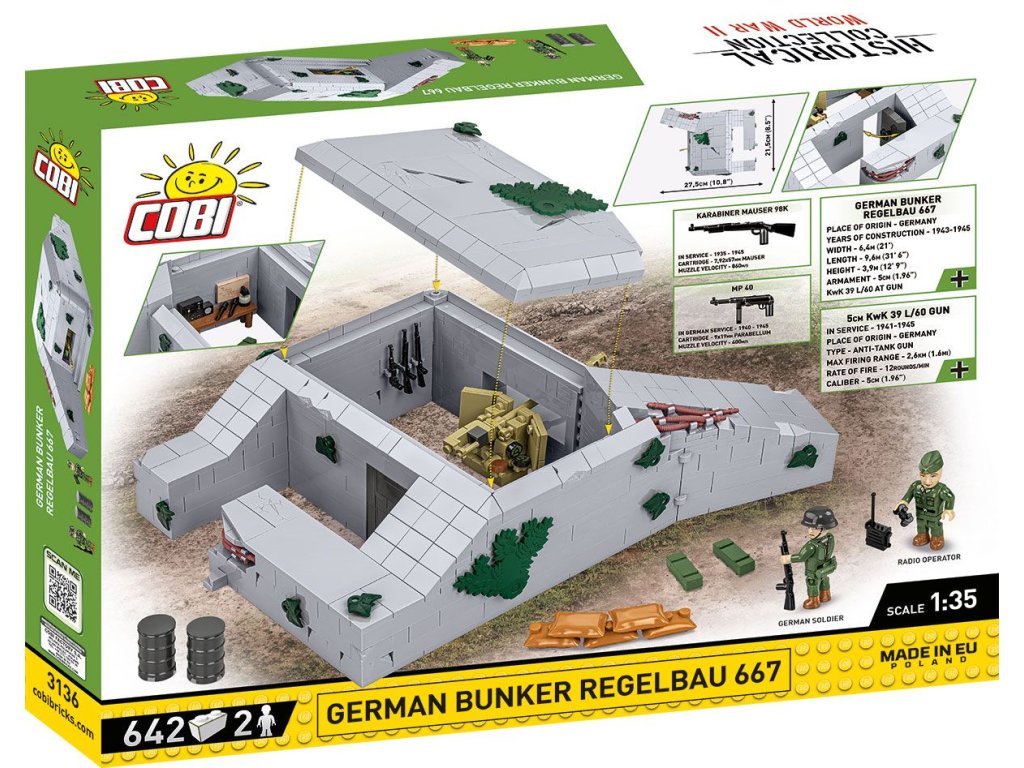 Model Regelbau 667 v měřítku 1:35 je postaven ze 642 kostek stavebnice, které byly navrženy s velkým důrazem na detail. Najdete zde například otevírací střechu, díky které se můžete podívat dovnitř bunkru a zjistit, jak vypadaly bojové pozice a vojenská technika. Celek je doplněn realistickými doplňky - od sudů a pytlů s pískem, rádiostanice, granátů, rostlinné kamufláže a protitankového kanónu Kwk 39L až po kulomety MP-40 a Mauser Kar98k - vytvářející autentickou válečnou scénu.