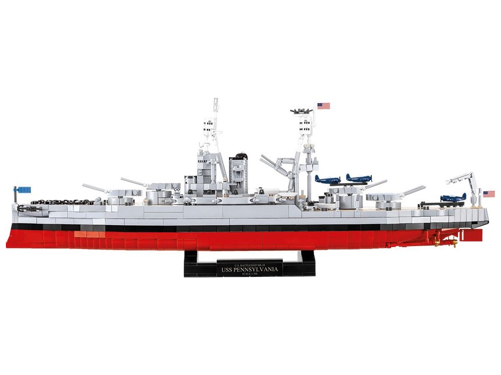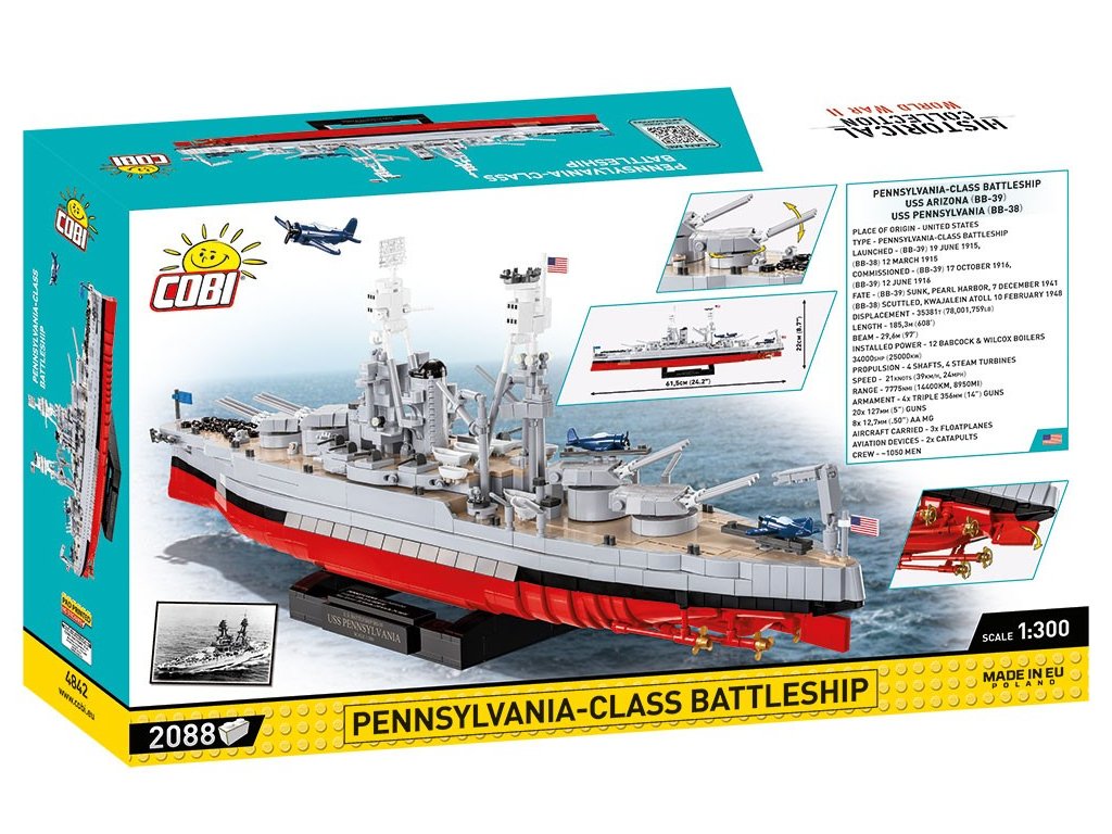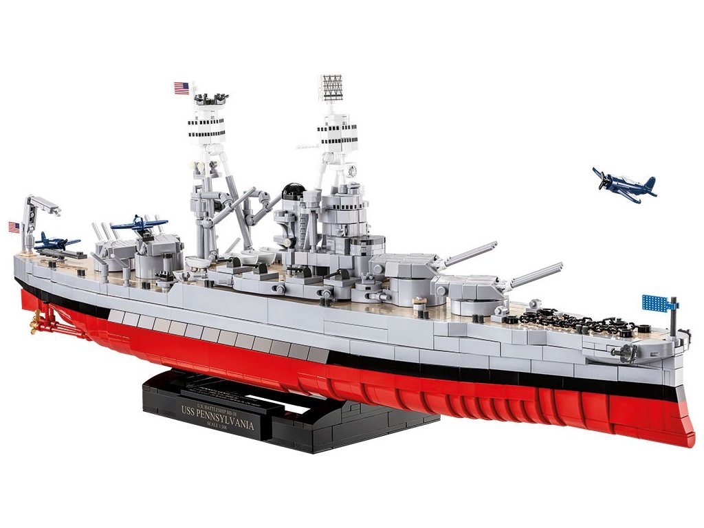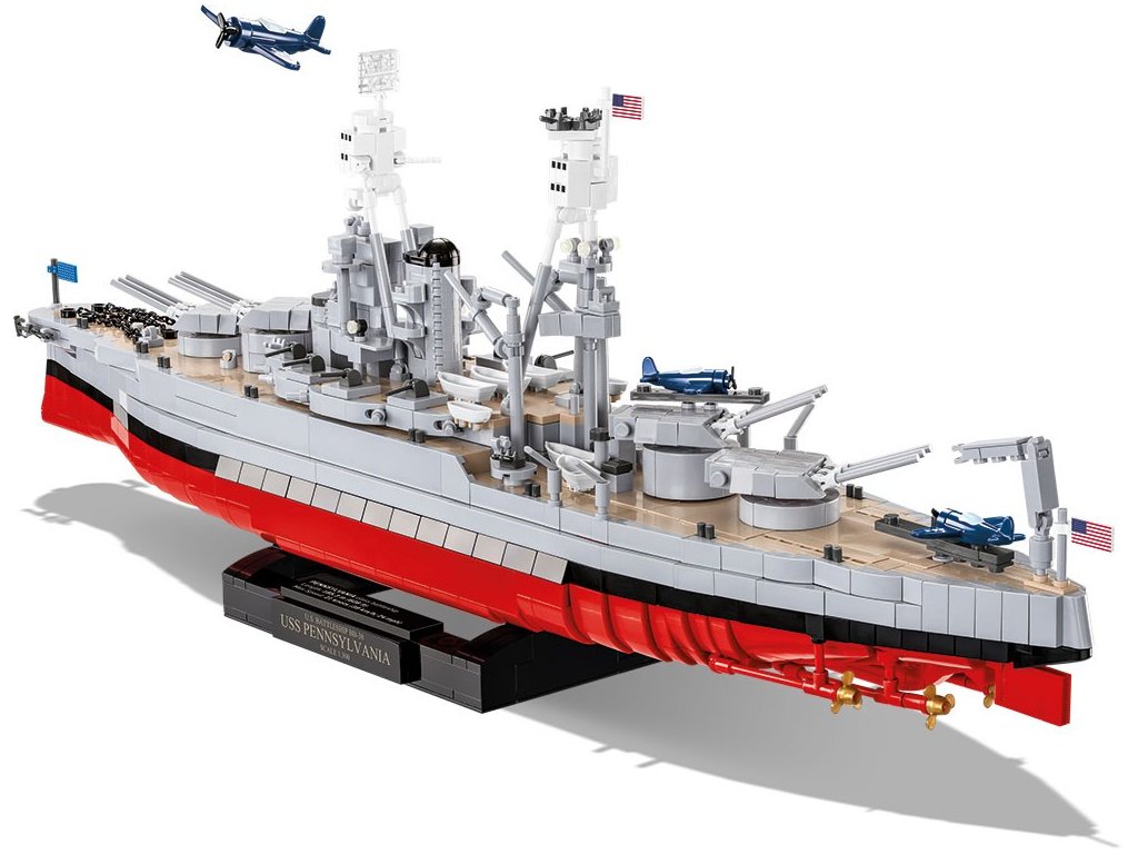 Sběratelská EXECUTIVE EDITION nabízí dvě možnosti stavby historické bitevní lodi třídy Pennsylvania! Díky přiloženým doplňkovým kostkám se značením a prvky lodních detailů si můžete vybrat konstrukci USS Pennsylvania nebo USS Arizona! Jasný a intuitivní návod vás snadno provede procesem stavby. Loď byla navržena v měřítku 1:300 a je dlouhá 61,5 cm! Více než 2 000 kostek poskytne hodiny vzrušujícího stavění. Verze Executive obsahuje také stojan na vystavení modelu, na který můžete připevnit černé plakety s technickými údaji a názvem lodi. Díky použití nejnovějších prvků a pokročilých konstrukčních technik model věrně odráží proporce historické lodi a zachovává všechny její podstatné prvky, včetně původního, velmi charakteristického tvaru trupu a nástavby. Model má četné pohyblivé části, jako jsou: lodní šrouby, kormidla, otočné věže a hlavně děl, které lze zvedat a spouštět. Sada je také perfektním doplňkem sbírky historických lodí COBI.