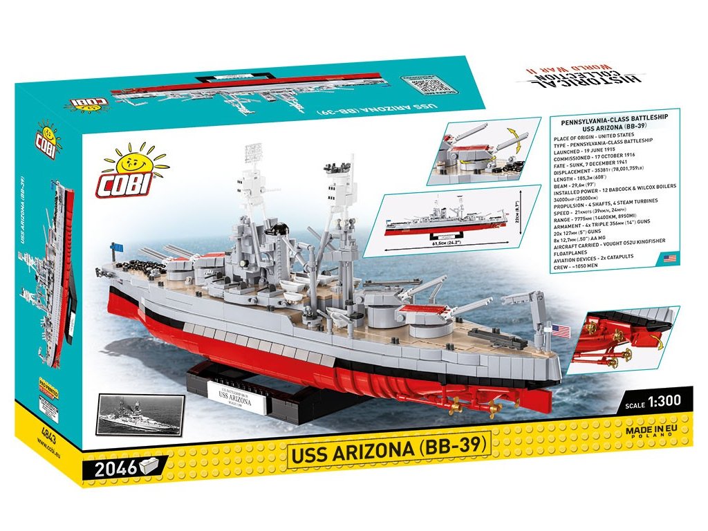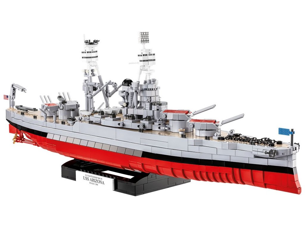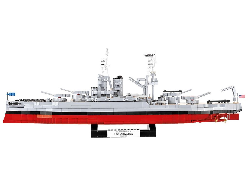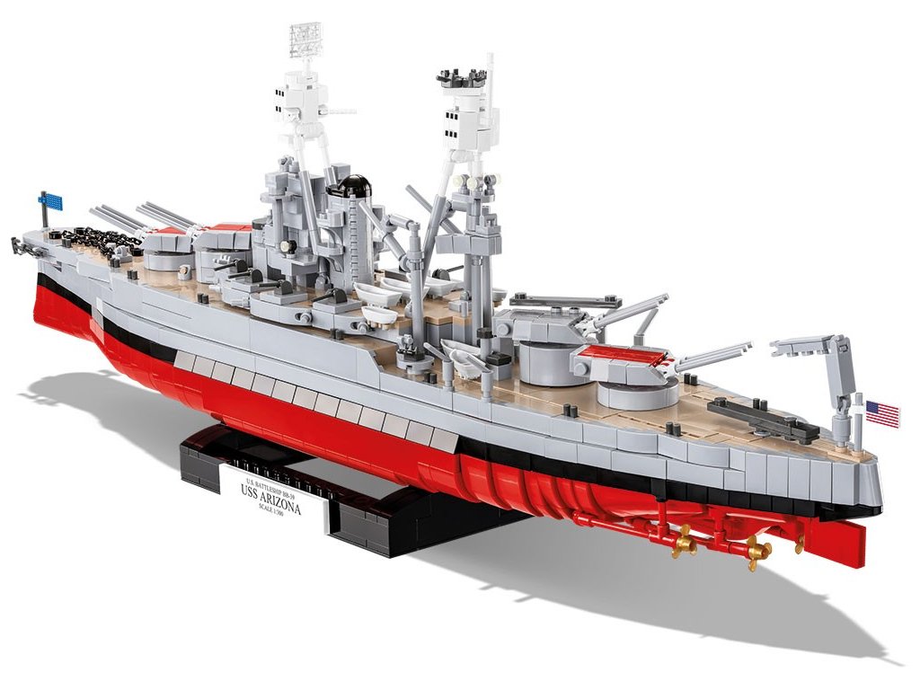Postavte si model bitevní lodi USS Arizona, která byla spuštěna na vodu během 1. světové války. Během služby byla loď modernizována. Arizona se nacházela v Pearl Harboru během japonského útoku 7. prosince 1941. Během náletu došlo na palubě lodi ke katastrofálním detonacím. Zemřely tři čtvrtiny posádky a loď se potopila, stala se tak symbolem japonského útoku. Vrak bitevní lodi nebyl nikdy vytažen. Balení obsahuje 2 046 kostek stavebnice a model je v měřítku 1:300.